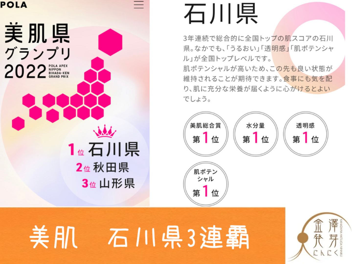 石川県は美肌ランキング第1位(POLA発)の県。金澤発芽にんにくにもさまざまな美容成分が含まれてますし、その他にも健康促進に効果が期待できる成分がたくさん含まれてます。