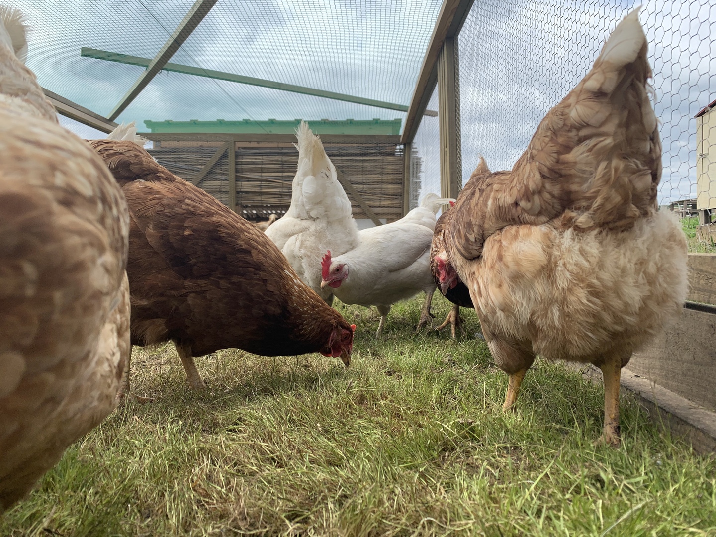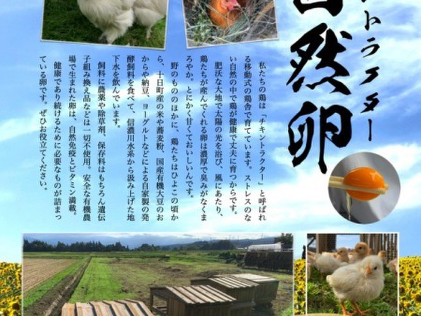 チキントラクターによる福祉養鶏を実践。自然環境の中、草の上でストレスなく過ごしている鶏に“野のもの”のほか、農薬や保存料不使用の原材料を厳選し有機JAS認証品など自家配合の発酵飼料を与え育てています。