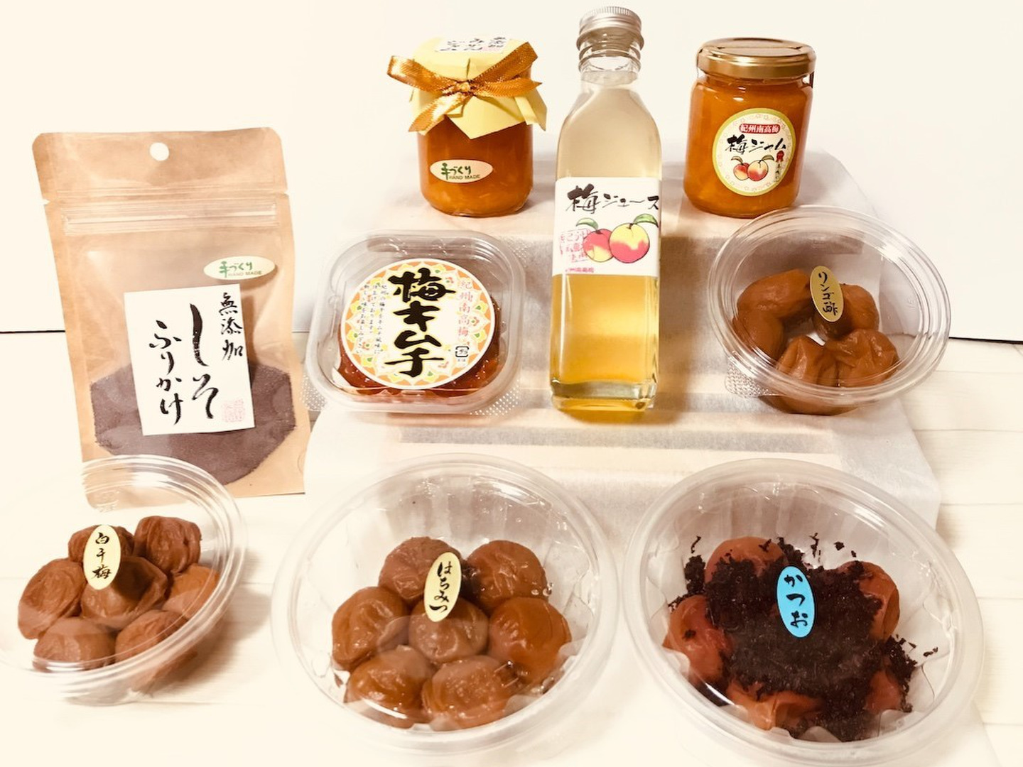 キムチ梅、リンゴ酢梅、はちみつ梅、かつお梅、白干梅、梅ジャム、みかんジャム、梅ジュース、しそふりかけ