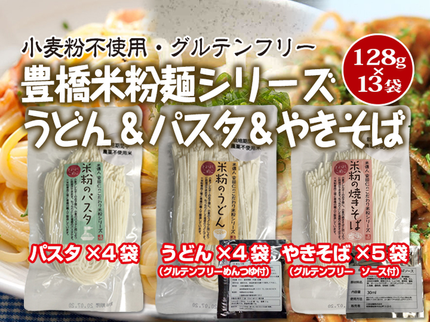【グルテンフリー】米粉のうどん(グルテンフリーめんつゆ付)(4袋)&パスタ(4袋)&焼きそば(グルテンフリーソース付)(5袋) セット(とよはしこめこ使用)