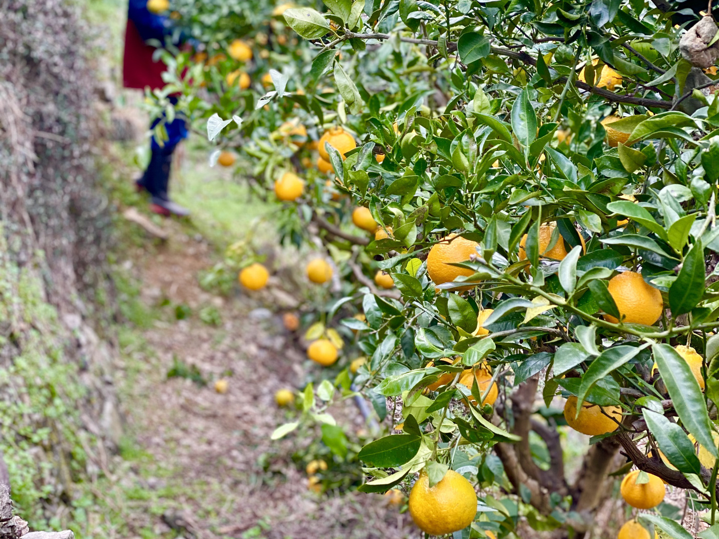 園地の地形は水捌けの良い石積みの段々畑です。日光を受けた石積みは地温を高め、柑橘に最適な環境を実現しています。降った雨は礫の多い土中に浸み込み、石垣からさっと抜けていきます。