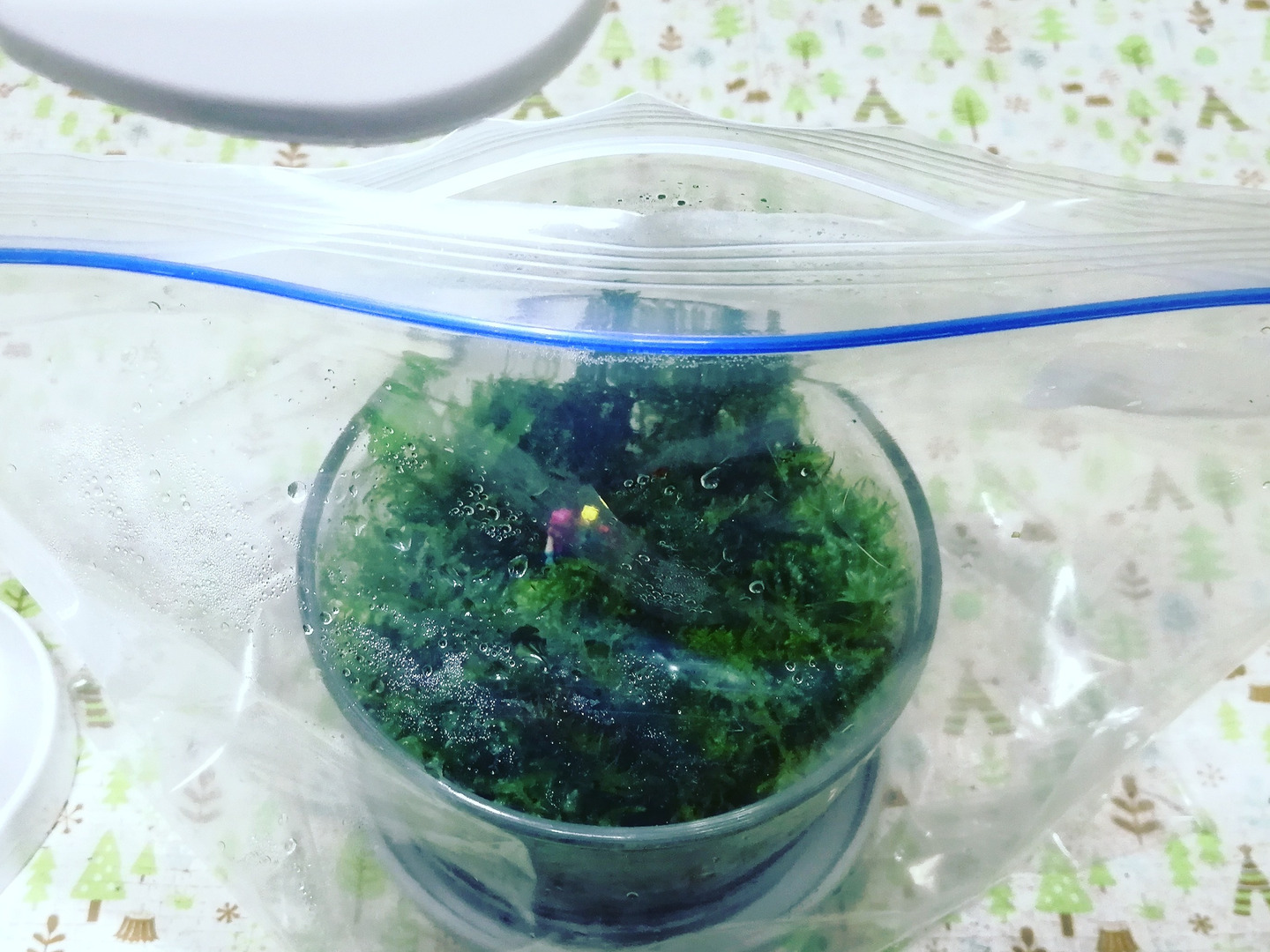 リビングなどお部屋が乾燥気味で苔の乾燥による苔の茶色い変色が目立つ場合は、保湿するために透明のポリ袋を被せたり、フリーザーバックに入れたりして様子を見てください。