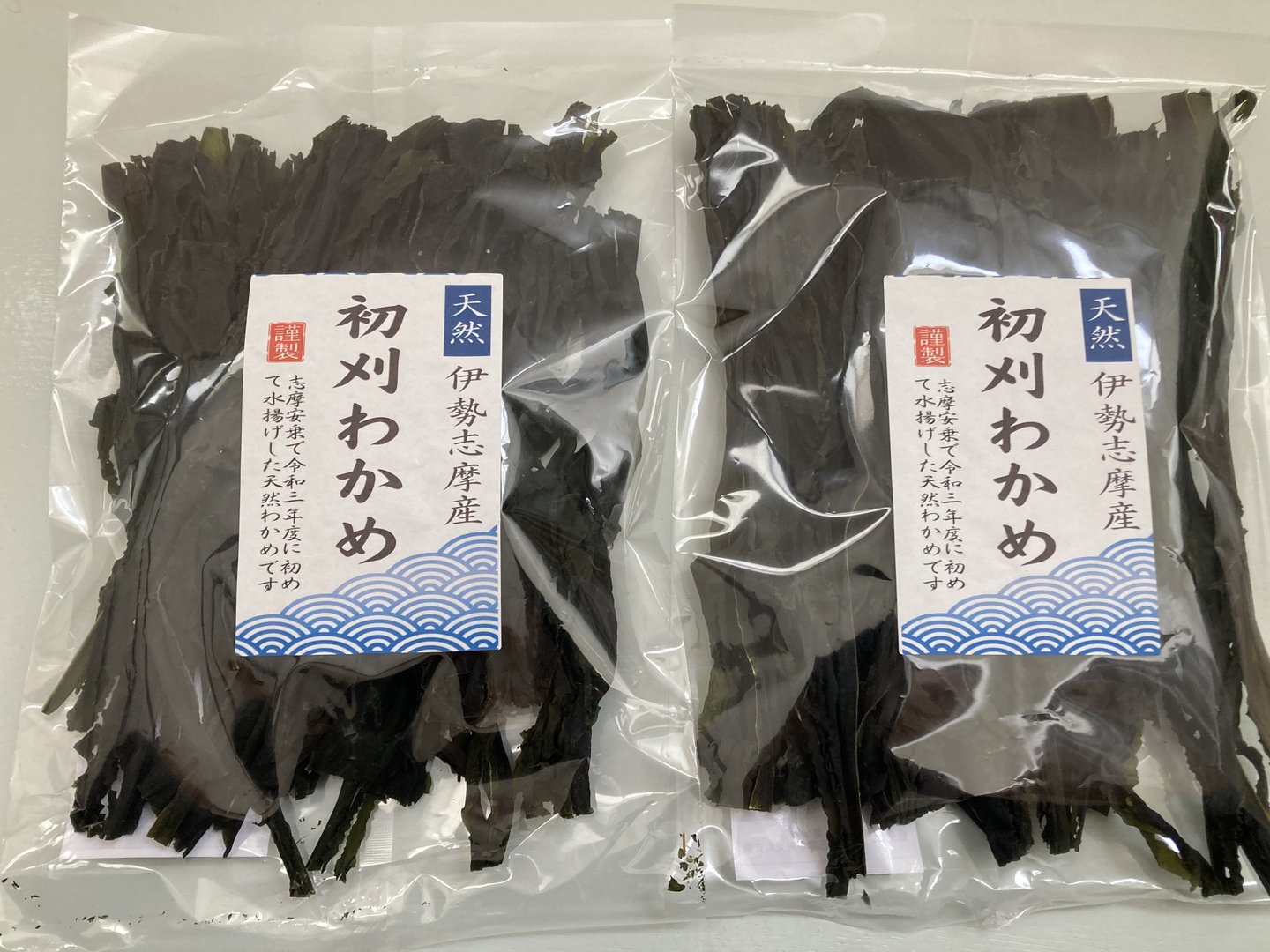 内容量は(初刈りワカメ50g)×2袋の(合計100g)でワカメ3〜5本分入っています。(今年の初物なので成熟して固さがでる前の若いワカメです)