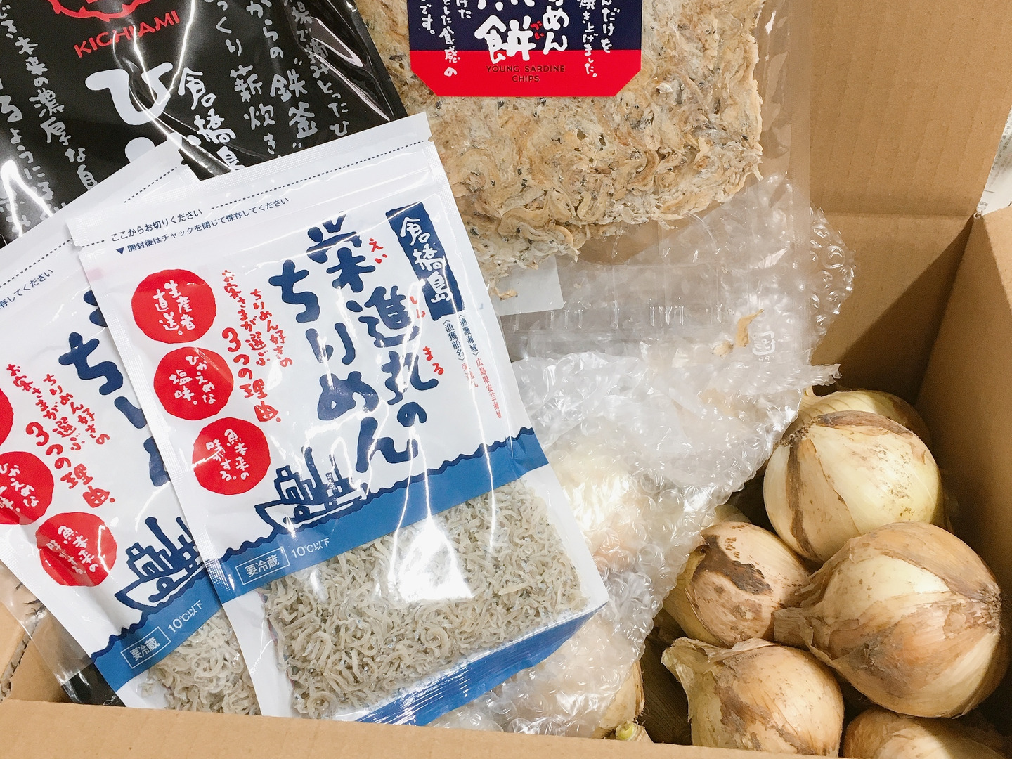 | 内容 | 段々畑の新玉ねぎ4キロ ちりめん55g2袋 煎餅1 ひじき20⒢2 | ||||||
