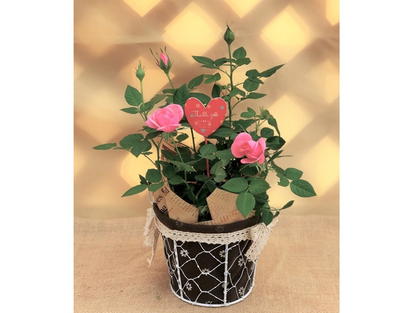 <商品概要> 母の日のピック付きの中輪形のコルダーナローズ1色が植えてあります。ギフトなどの贈り物にも最適です。