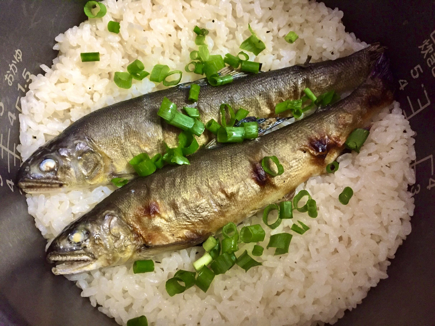 炊き込みご飯の要領でお米を用意し、最後に塩焼きにした鮎を乗せて炊飯器をセットします。炊き上がったら鮎を取り出し、頭、骨、ヒレを取り除いて身をほぐしてください。炊飯器にほぐした身を戻し、混ぜ合わせたらできあがりです。