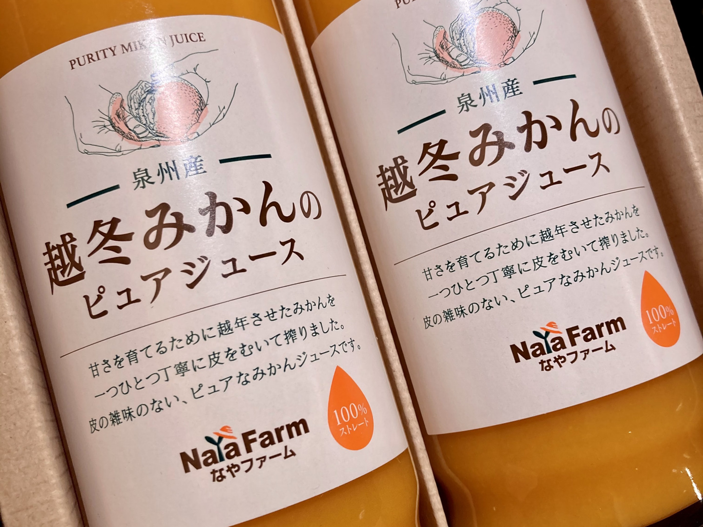 そのみかんを年明けに搾る日程を製造元と予め決め、鮮度を可能な限り上げる為に、ギリギリまで樹上で実らせ収穫、1つ1つ丁寧に皮をむき、雑味のない越冬みかんジュースを完成させました。