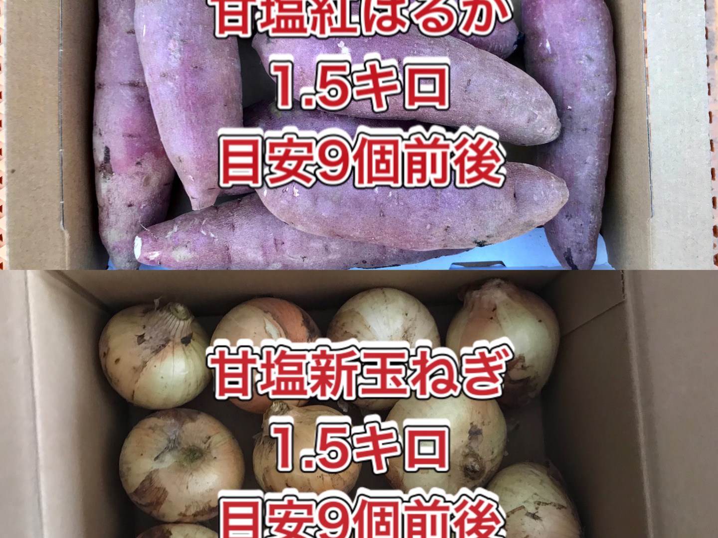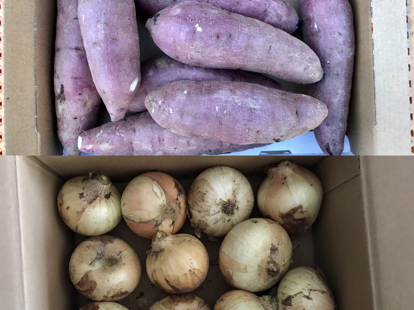 鹿児島産の新玉ねぎ1.5キロ前後、サツマイモ1.5キロ前後注文を受けてから、収穫日に収穫した箱込み3キロ前後を畑の空気も収穫しながらAB品大中小混合箱詰めして、当日発送します^_^