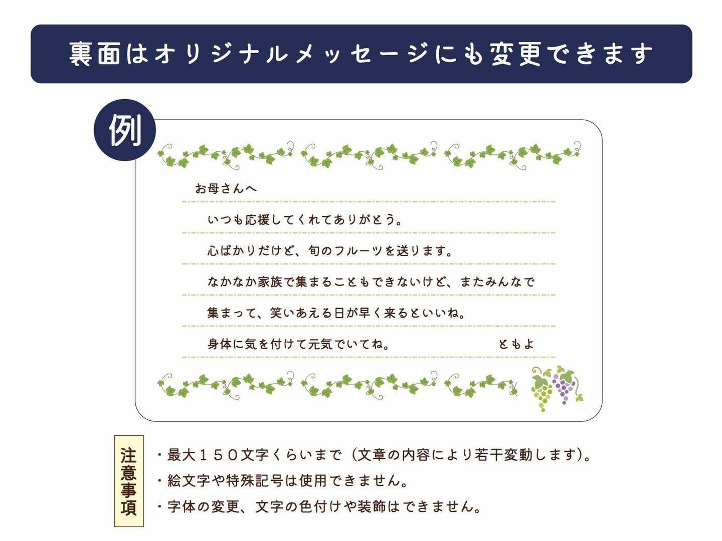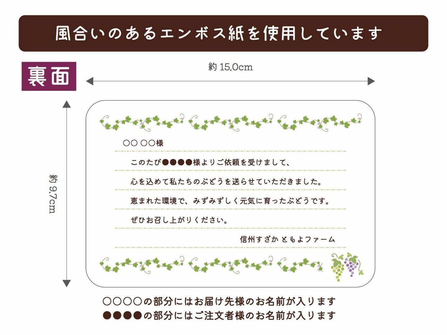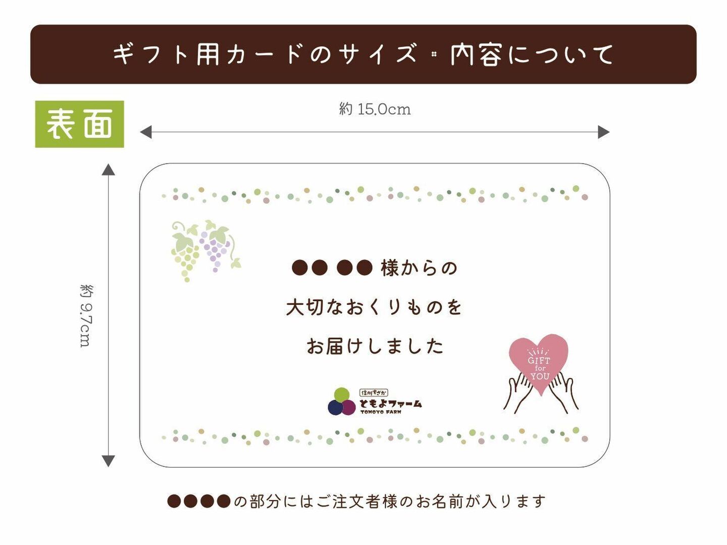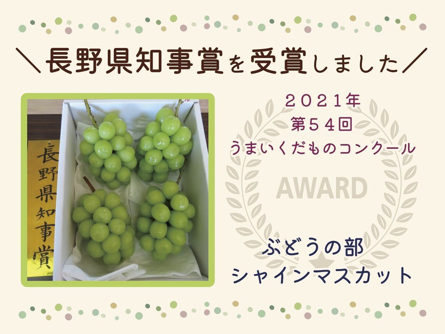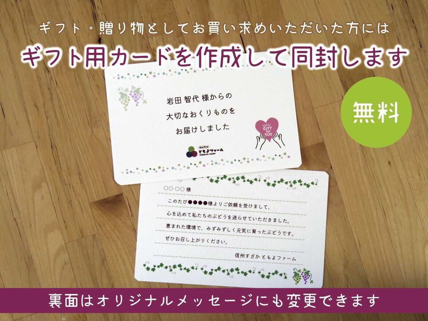 商品について あわせ買い対象 同生産者の別の「あわせ買い対象」商品と一緒にご注文いただくと、送料をまとめてお届けできる場合があります。 生産者からのお知らせ 配送方法(クールor常温)がお選びいただけますシャインマスカットは同じ規格で「クール」「常温」の2種類をご用意しています。残暑が長く続く予報となっていますので推奨はクール便ですが、収穫当日のうちに発送しますので、ご希望に合わせてお選びいただけますでしょうか。 もっと見る 内容 シャインマスカット2房(1kg以上) 重量・容量 約1kg 発送 ヤマト運輸 送料 ¥ 常温便 + ¥ 0 数量1点ごとに送料が発生します。 種別 果物 ぶどう シャインマスカット 産地 長野県 農薬節約栽培 果物 贈答品 家庭用 動物性堆肥不使用 紙包装 シャインマスカット 長野県x果物 長野県xぶどう 長野県xシャインマスカット 商品説明 受付を開始しました(2025.9.23更新)\おすすめポイント/全体的な形や粒の大きさにもこだわって選果します。大切な方への贈りものとして好評をいただいておりますが、自分自身へのご褒美としても是非どうぞ。ちょっと贅沢?高級フルーツ店に並んでいるような一級品には及ばないかもしれませんが、下記の独自基準を満たしている“イケメン・イケジョ”の房をお届けします。・房の形が比較的揃っている・粒と粒の間の隙間が少ない・全体的に粒が大きめで張りが良い・表面に目立つ汚れやキズがほとんどない*あくまでも園主の判断となりますのでご承知おき願います。受け取って封を開けたときに、思わず笑みがこぼれてワクワクしてもらえるような様子を思い浮かべながら、時間をかけてしっかり選別してお送りします。ギフト用カードをお入れしますギフト用としてのご購入(お届け先を別指定いただいた場合)は、お名前入りのギフト用カードを作成してお入れします(*無料)。ギフト用カードの内容については商品画像をご覧ください。ギフトでのご注文誕生日や記念日など、指定日があるギフト発送の方はご注文時に特記事項にご入力をお願いします。確実なお約束ができないため日付や曜日の配送指定はお受けできないことをご理解いただきたいのですが、できる限り時期外れの配送とならないように対応しております。オリジナルメッセージへの変更も承りますオリジナルメッセージご希望の場合は、ご注文手続きの際に「特記事項」へご希望の旨をご入力ください。こちらから連絡機能にてご連絡いたします。内容量について1房500グラム前後のシャインマスカットを「2房」選んでお送りします。合計1kg以上(ぶどうのみ・資材等は除く)となるように組み合わせてお送りします。包装についてぶどうはライス紙と呼ばれる薄紙を数枚重ねて優しく包み、緩衝材にはウッドパッキンや紙パッキンを使用します。環境に配慮した“脱・プラスチック”包装でお届けします。なお、薄紙は乾燥を防ぐ効果があるため、そのまま保存用としてもご利用いただけます。収穫&発送について収穫した当日のうちに発送します。せっかく選んでいただく「生産者直送」という機会ですので、収穫後は少しでも早くお手元にお届けして、できるだけ新鮮な状態でお召し上がりいただきたいと考えています。配送方法について配送業者はヤマト運輸を利用します。商品発送後は、発送当日のうちに食べチョク経由で伝票番号を添えて発送した旨をご連絡します。ご注文前にご留意いただきたいこと農産物の特性上、見た目や味わいはいつも同じものをお届けすることができません。また、種をなくす栽培を実施しておりますが、植物の性質や本能が上回ることでまれに種が入ってしまう場合があります。*商品画像にある「ご留意いただきたいこと」もお読みいただき、ご理解いただいたうえでご注文をお願いいたします。農薬節約栽培について2025年は長野県の基準を24%削減して栽培しています。*成分カウントより算出 もっと見る この商品のことをお友達にもシェアしませんか ポスト シェア