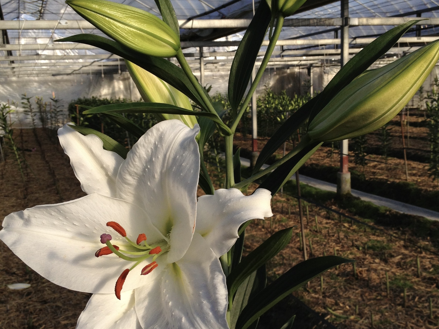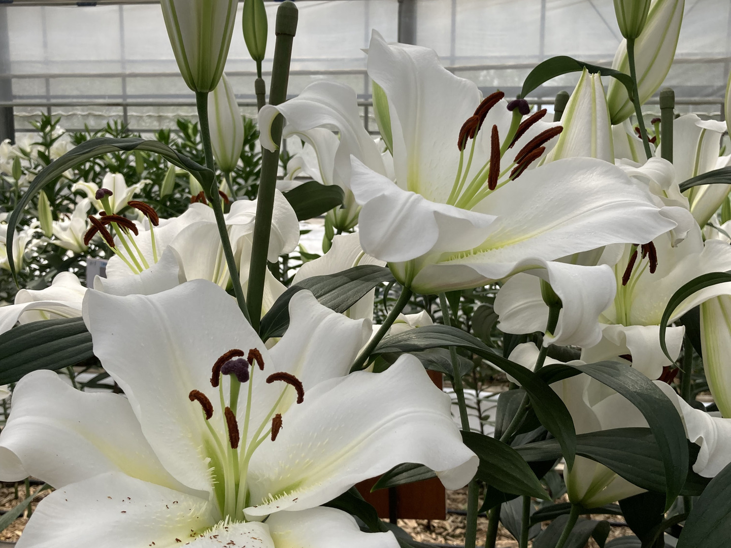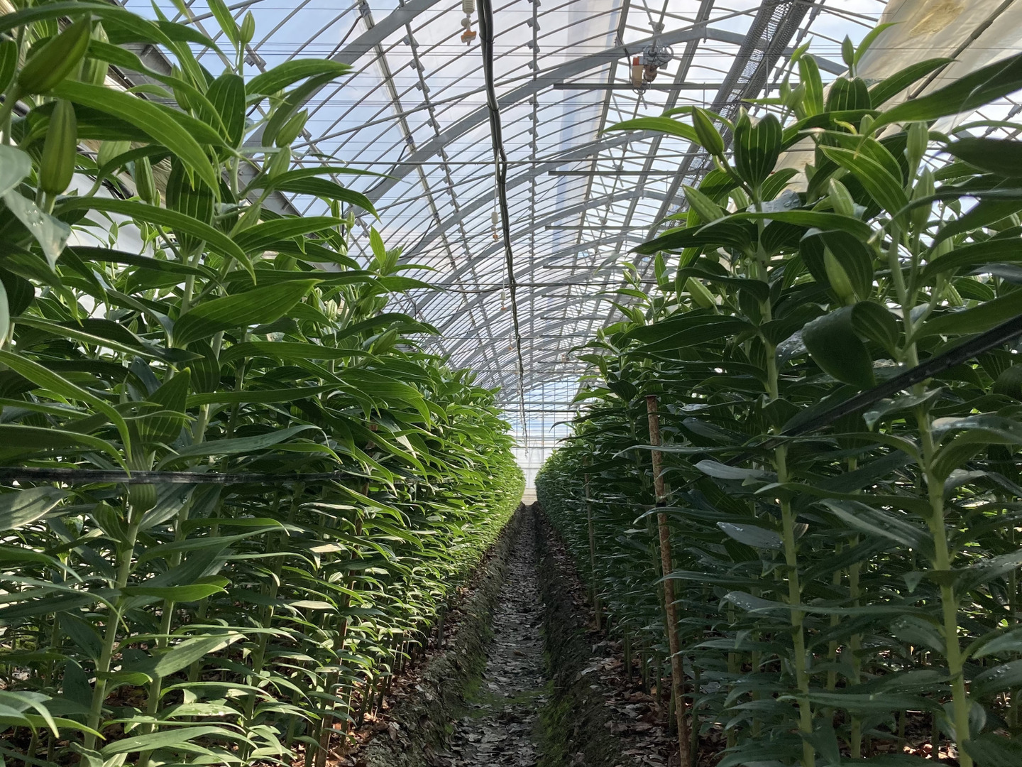 品種によりますが、夏場は花のツボミが小さくなります。高温のため植物の成長が早く、つぼみが大きくなる前に花が咲こうとしてしまうからです。冬場に比べると花が小さくなってしまう品種に関しては、本数を増やして対応しています。特に、シンプルな白の品種が該当します。夏場でも、白い大きな花の品種が収穫されている時期は、箱ギリギリの梱包になりますので本数はそのままです。