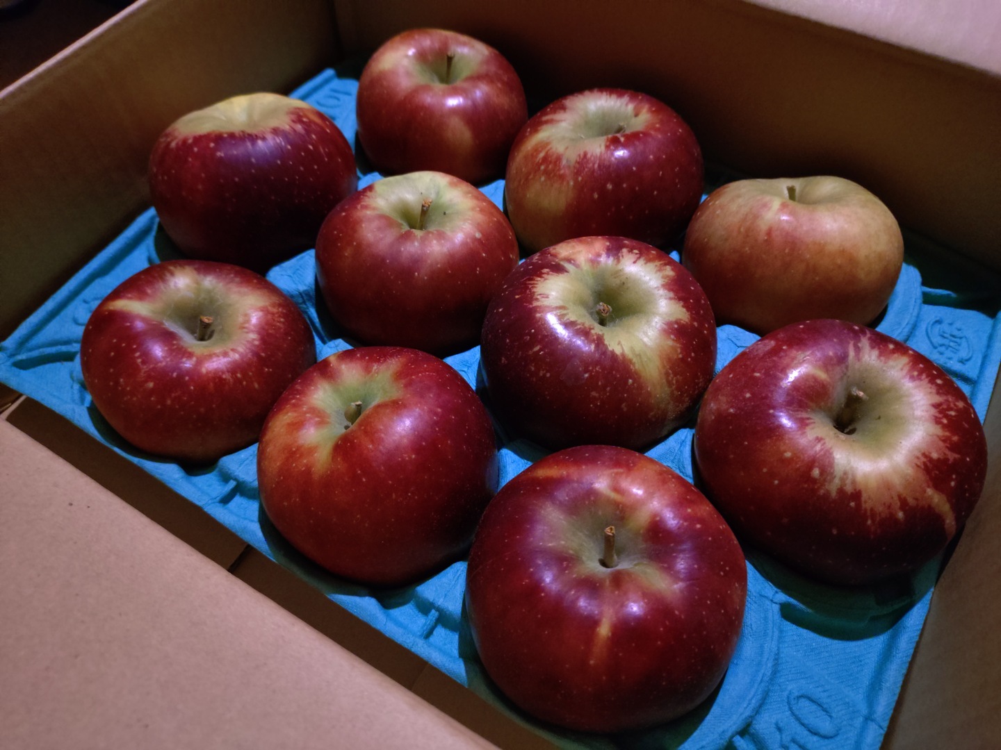 一般的に思い浮かべるりんごは「明るい赤色」をしていますが、秋映は栽培地の気温によって「暗めの赤(暗紅色=赤黒い色)」に着色する為、知らずに見ると驚くかもしれません(長野県産は赤黒いことが多いです)。