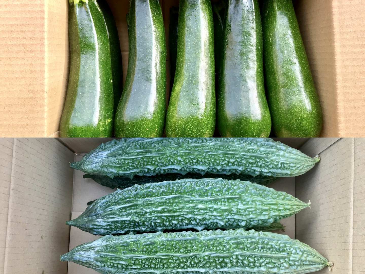 鹿児島産のズッキーニ3キロ前後、ゴーヤ1キロ前後注文を受けてから、収穫日に収穫した箱込み4キロ前後を畑の空気も収穫しながらAB品大中小混合箱詰めして、当日発送します^_^