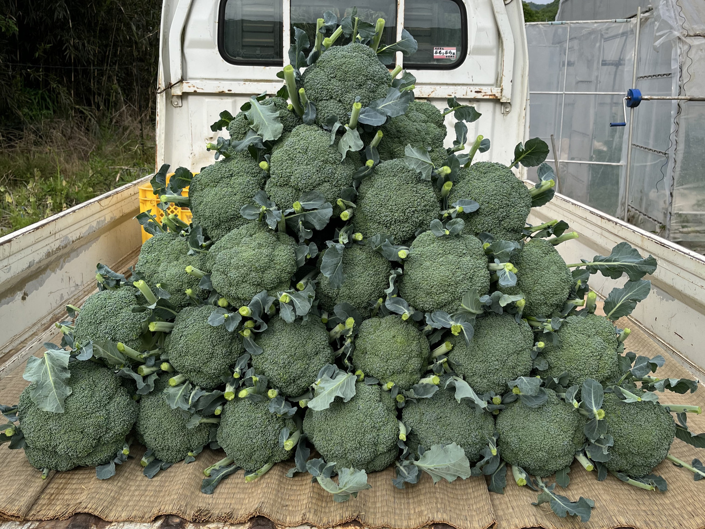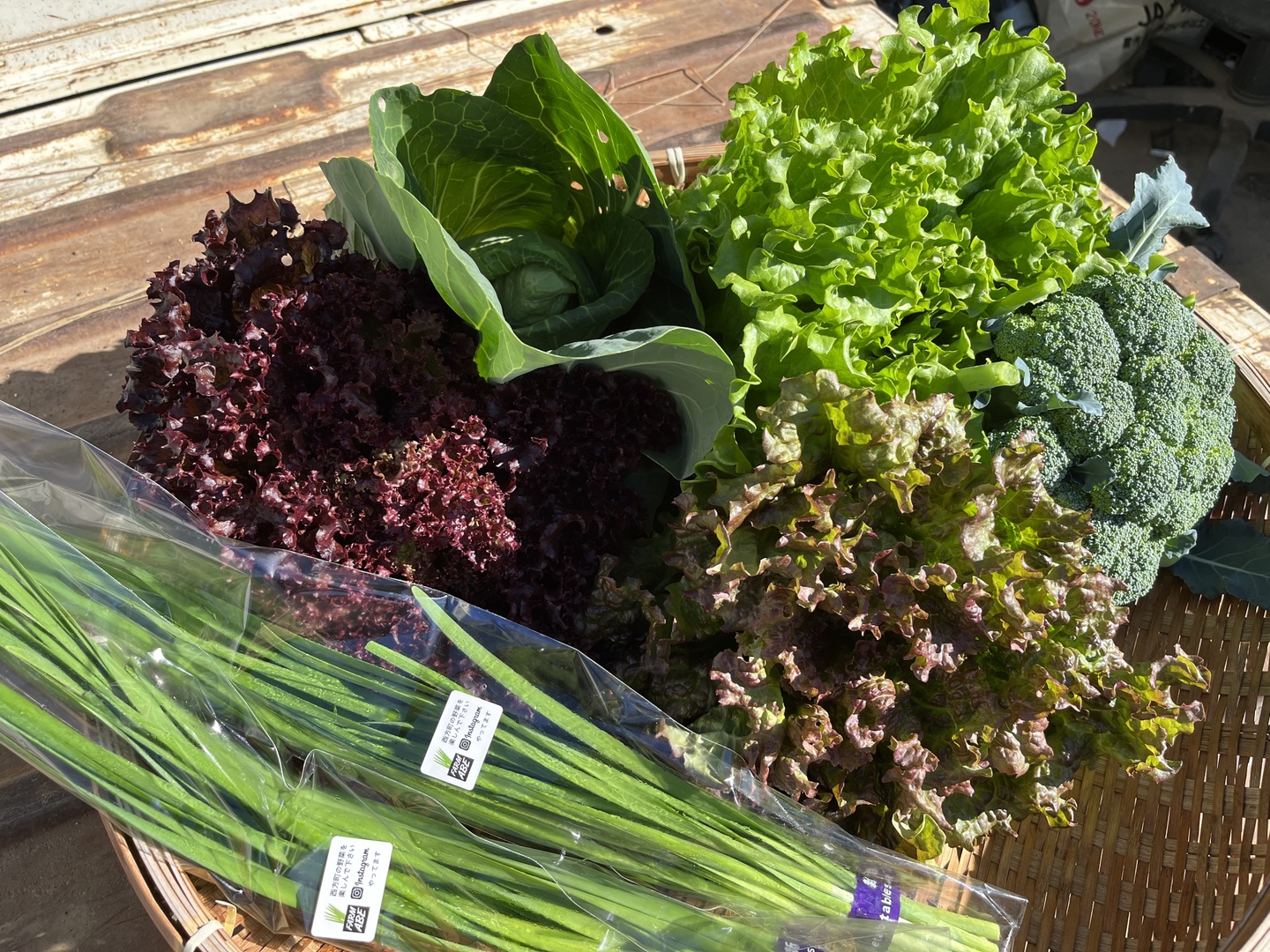 5月現在、ニラ、ブロッコリー、レタス3種、新玉ねぎ、新じゃがいも、みさきキャベツ(小さめ)