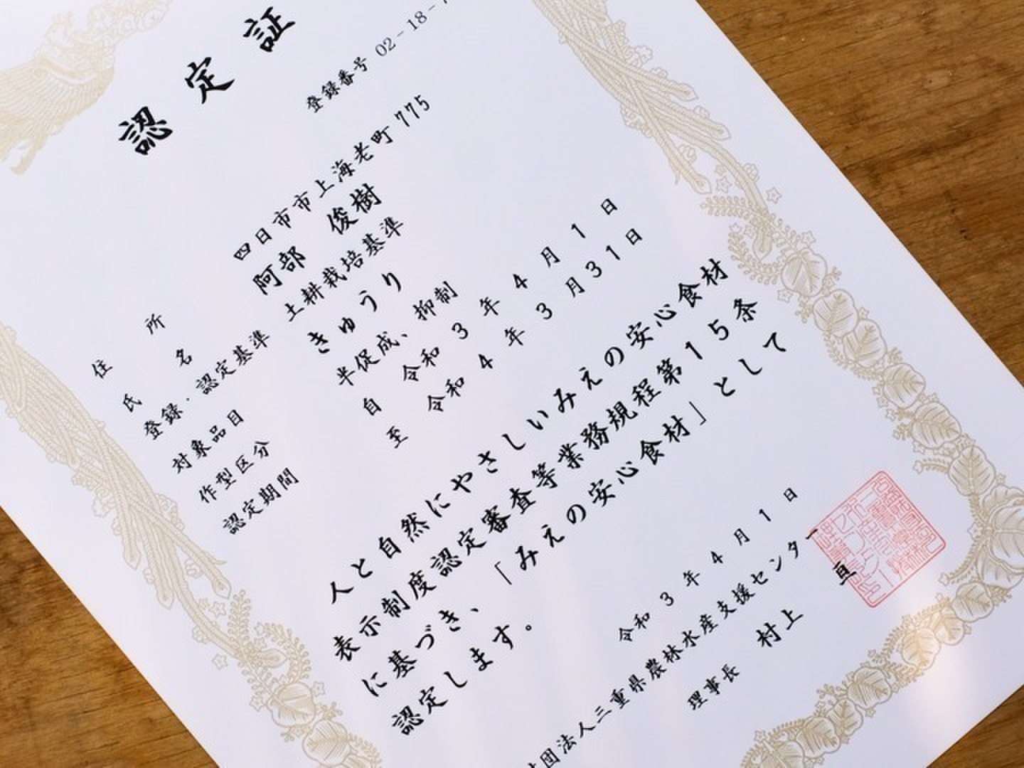 第三者機関の三重県農林水産支援センターが現地調査を行った上、化学農薬の節減や有機質肥料・堆肥の循環活用などにより、環境にやさしい生産を行っているとして認定を受けています。(登録番号02-18-751)
