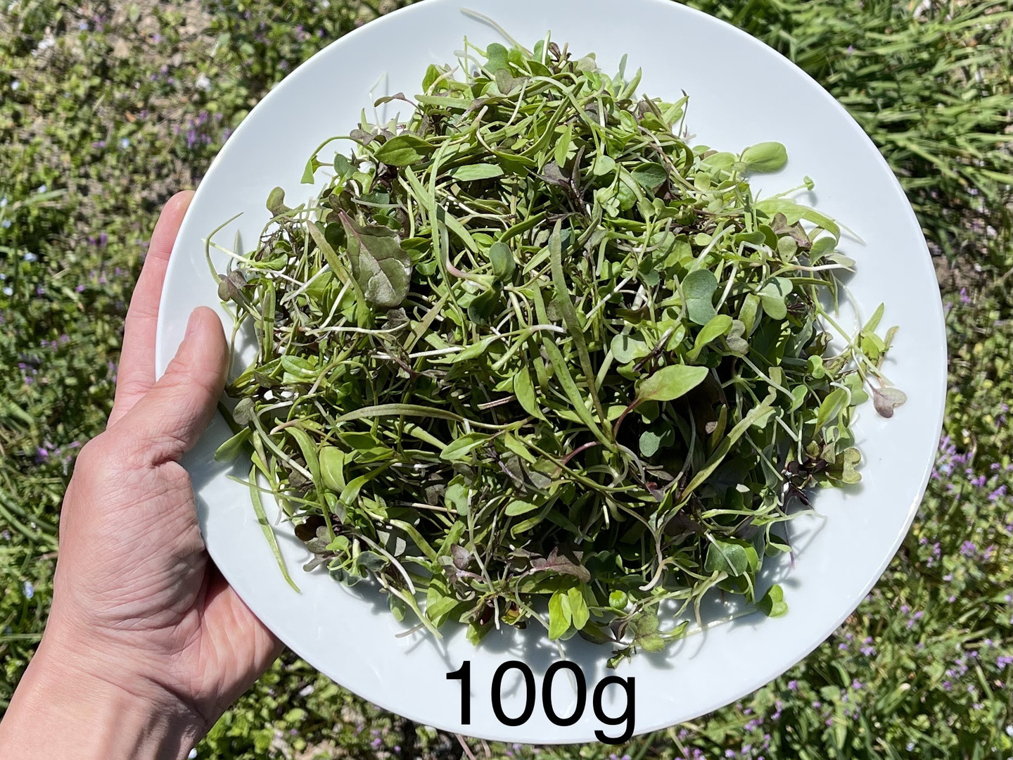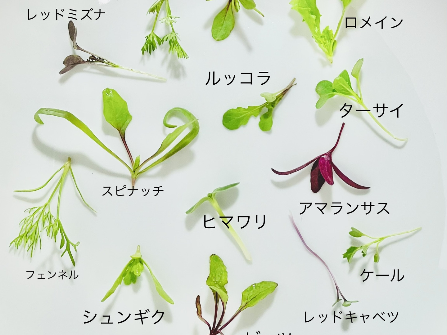 季節により異なりますが、ルッコラ、ケール、ミズナ、レッドミズナ、ラディッシュ、ヒマワリ、エンサイ、アマランサスなどから4~5種類のミックスです。上記以外がミックスになる場合もあります。