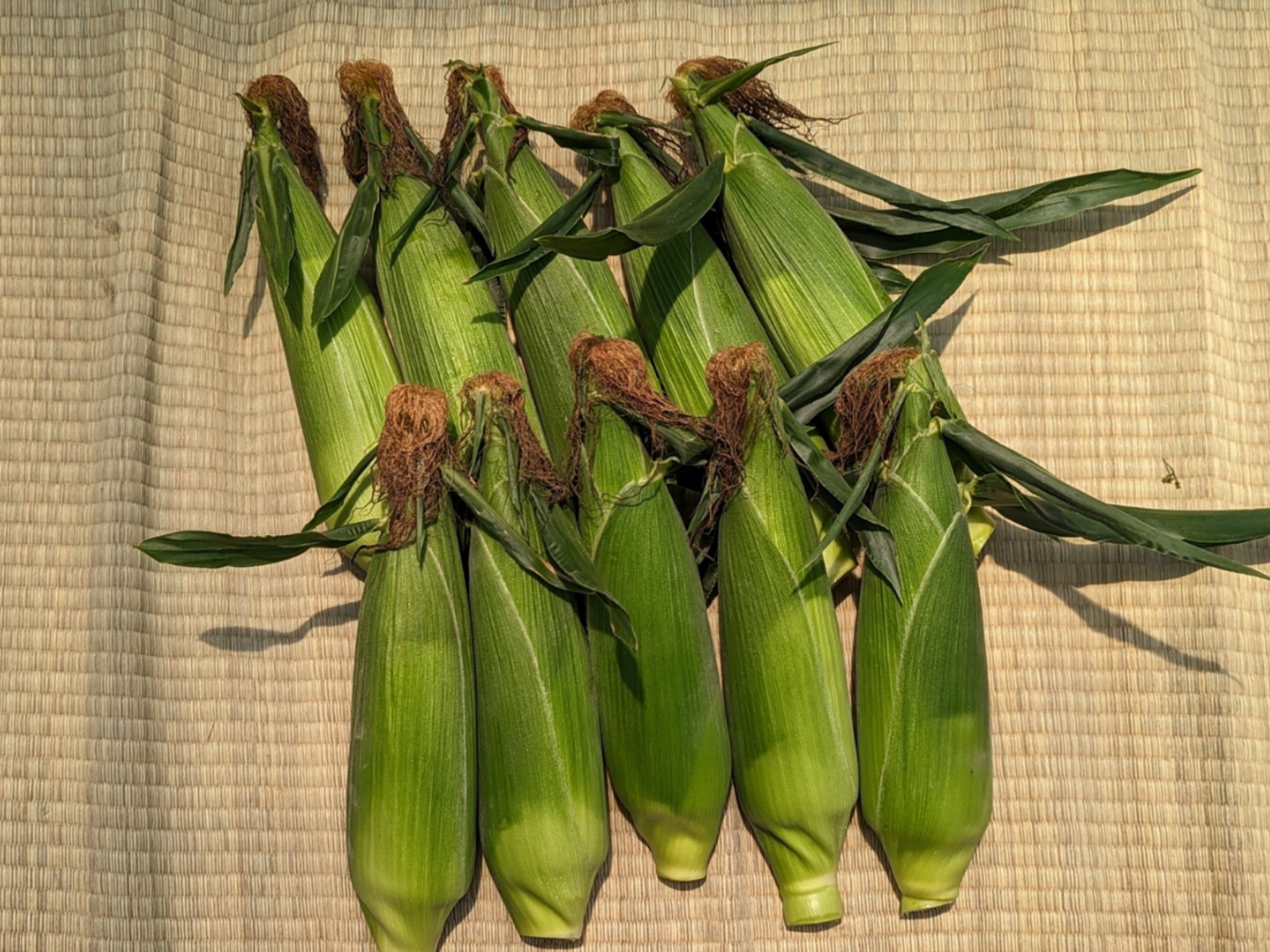 ※トウモロコシはアワノメイガによる虫食いが起きやすく、特に穂先が食べられたり、葉の中に虫が隠れたりする場合があります。農薬を極力減らしておりますので、「安全な証拠」としてご理解頂き、該当部分を除去して食して頂けますと幸甚です。
