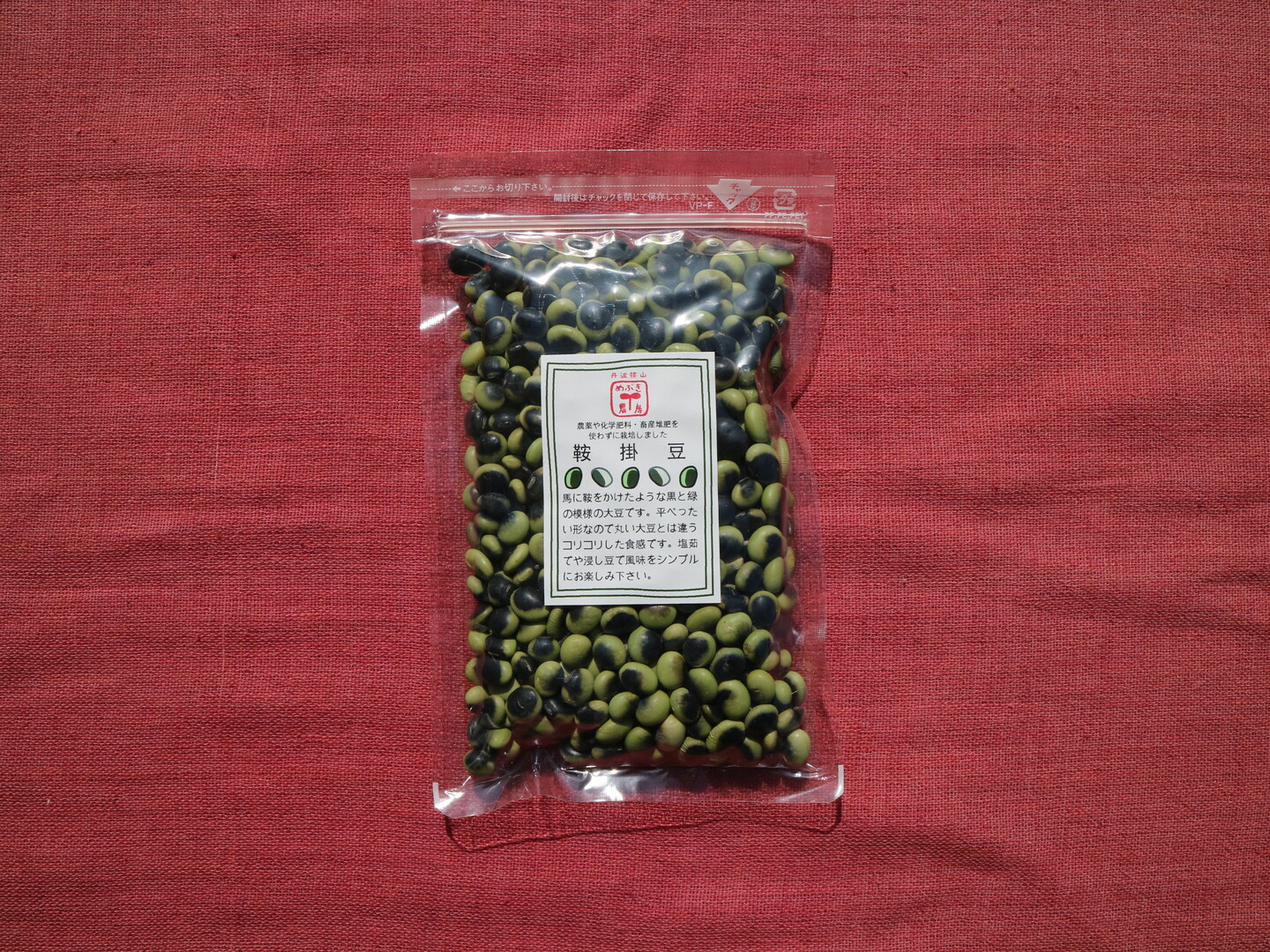 ●鞍掛豆・・・馬に鞍をかけたような黒と緑の模様の大豆です。平べったい形なので丸い大豆とは違うコリコリした食感です。塩茹でや浸し豆で風味をシンプルにお楽しみ下さい。