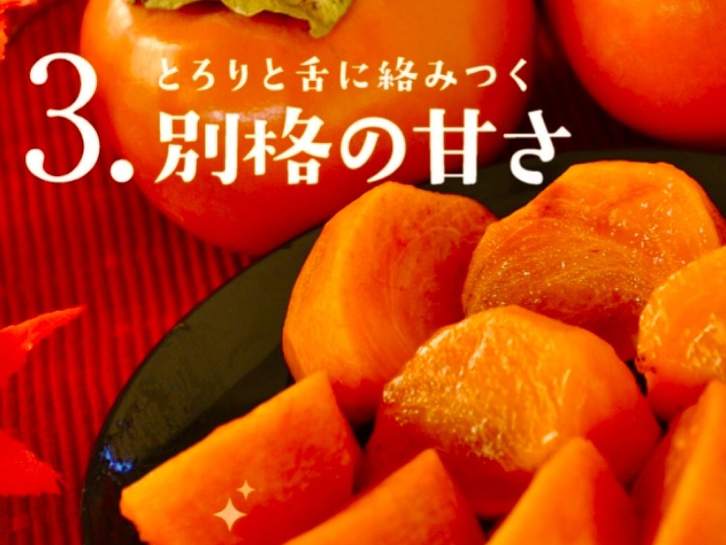 次郎柿はカリッコリッとした食感が特徴で1シーズンで平均糖度は16度以上、11月の下旬には20度を超えることもあります。そして暖かい場所にしばらく置いておくとさらに熟度が増し果肉が柔らかくなりトロッとした食感も楽しめます。