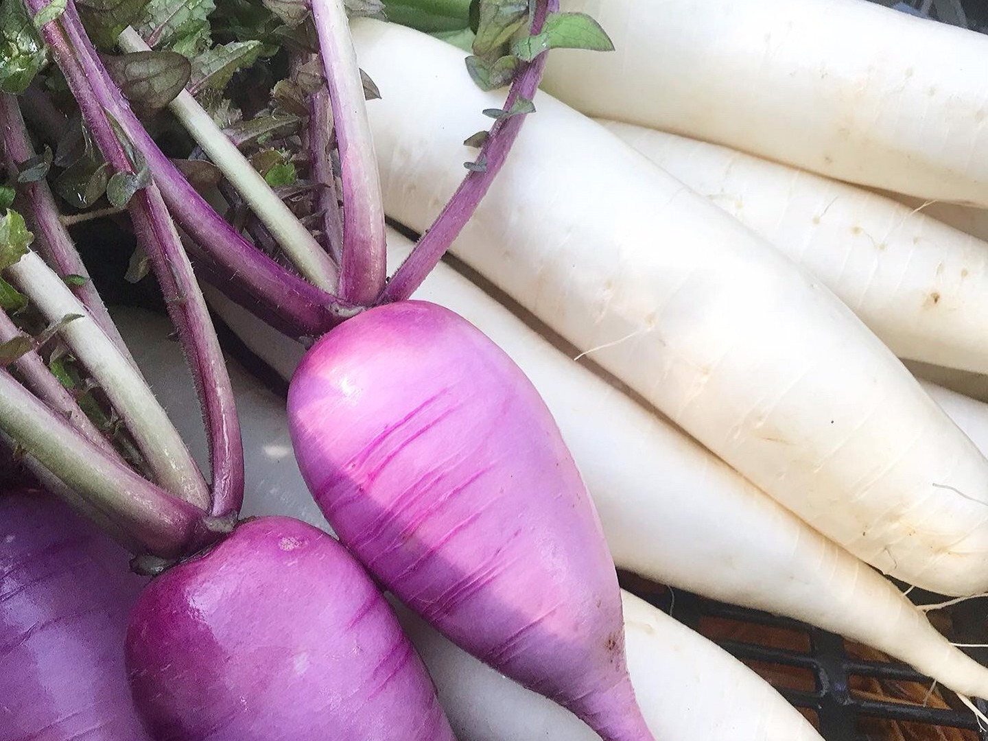 農薬・化学肥料不使用の葉付き大根白・むらさきミックス2kg