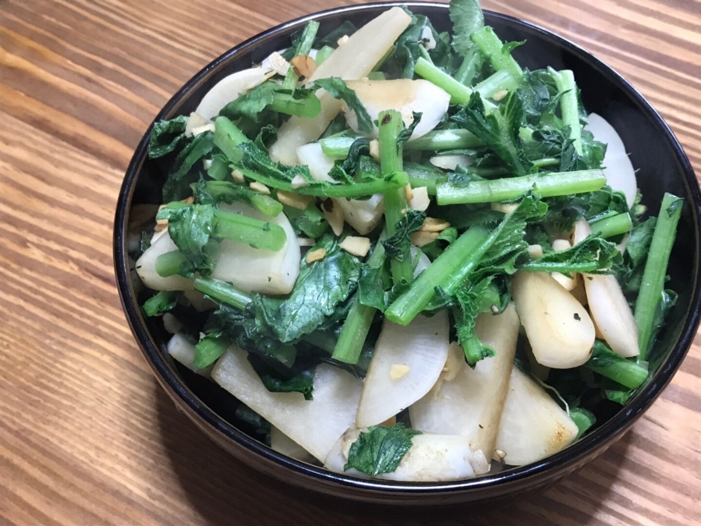 むらさき大根の葉は少しクセがあるので、炒め物に‼️