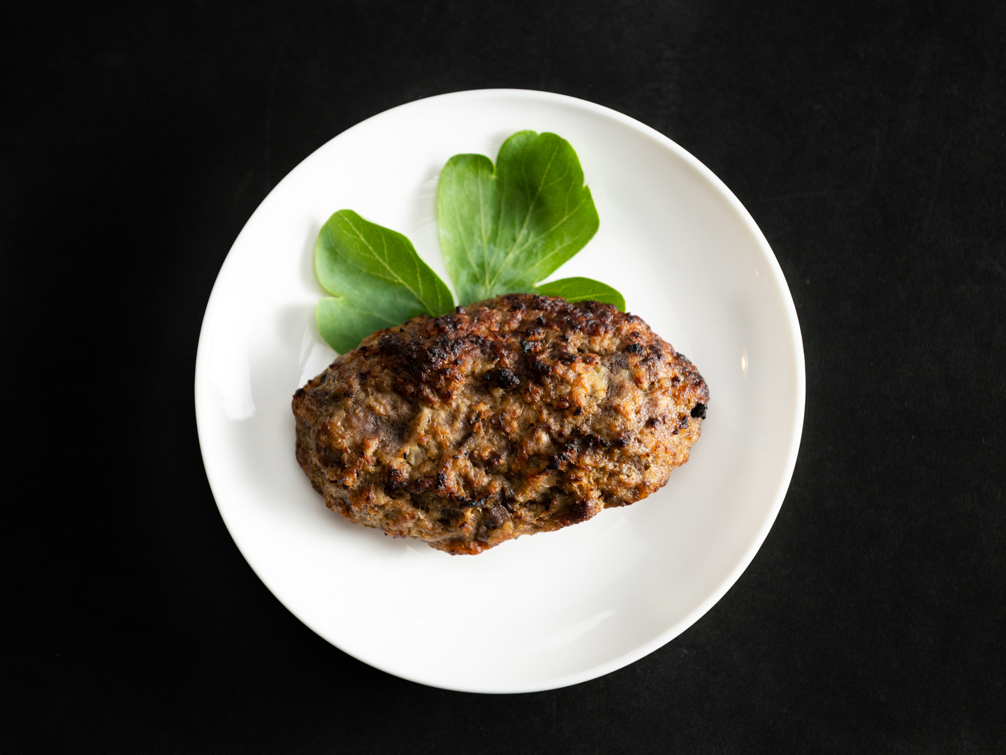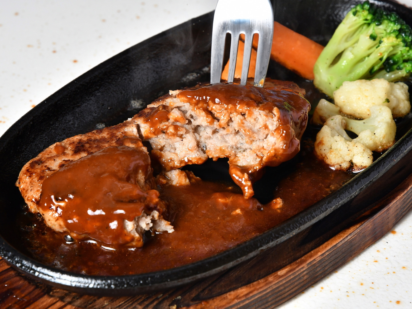 噛みごたえのある赤身のお肉と柔らかジューシーな脂身をそれぞれ別の大きさに挽いて、粗挽きのハンバーグに仕上げました。