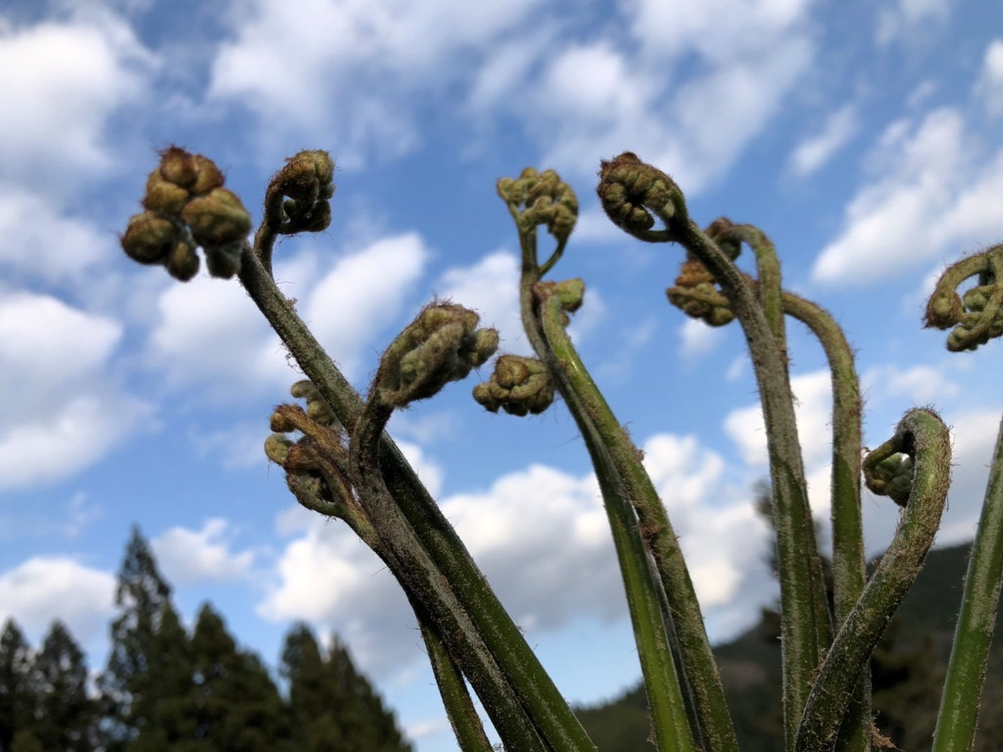 わらびはゼンマイと並び、日本で古くから親しまれている春の山菜の一種。先端の穂先が産毛に包まれており、渦巻き状の若い芽を食します。