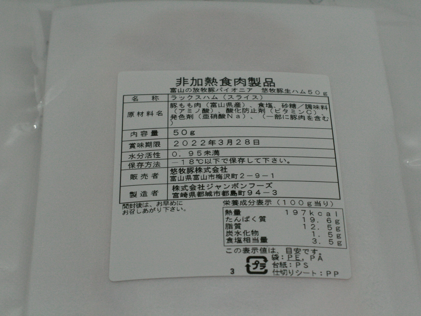 商品について あわせ買い対象 同生産者の別の「あわせ買い対象」商品と一緒にご注文いただくと、送料をまとめてお届けできる場合があります。 生産者からのお知らせ 基本として商品発送につきましては日曜、祝日を除き、2営業日いただいております。繁忙期や商品仕込み中はこの限りではありませんのでご注意ください。小さな会社ですので小回りは利きます。タイミングが合えば当日出荷も可能ですので随時お問い合わせください。 もっと見る 内容 生ハム50g 発送 ヤマト運輸 送料 ¥ クール便(冷凍) + ¥ 300 複数注文すると送料がまとまります。 種別 肉 肉加工品 ハム 肉 豚肉 品種おまかせ 加工品 惣菜系 ハム 産地 富山県 平飼い・放牧 肉 加工品 贈答品 家庭用 ハム 品種おまかせ 富山県x肉 富山県x加工品 富山県x豚肉 富山県x肉加工品 富山県xハム 富山県x品種おまかせ 富山県x惣菜系 富山県xハム 商品説明 本商品は合わせ買いに対応した商品です。送料が発生しますが1パックからお買い求めが出来ます。気になったアイテムに合わせてご購入下さい。8パックまでなら通常商品に組み合わせても送料そのままで発送が出来ます。お気軽にお問い合わせください。放牧育ちの豚肉は旨味が強く脂も甘い、肉好きを納得させる豚肉で仕込んだ生ハムです。使用する豚肉は悠牧豚、全国植樹祭両陛下への晩餐にノミネート、大手航空会社のビジネスクラス食材と採用された実績もあり、一定の評価をいただいています。使い勝手の良いスライス済を真空パック、劣化を極力防ぐため冷凍で発送します。プレミアムな生ハムは肉の味がよくわかるように塩気は少なく、燻製も控えめに仕上げています。50g使い切り。冷凍未開封で製造から1年、冷蔵未開封で45日の賞味期限になります。(現在出荷中の商品は令和5年7月上旬まで)使う分だけ解凍して常備しておくといざという時便利です。急な来客、ちょっとしたパーティーなどにも是非どうぞ!飲食店さんも使いきりならロスが少なくて便利ですね!うっかり解凍してしまっても45日もあれば使い切ることが出来ると思います。1枚ずつシートに分けてあるので綺麗にはがせますよ。※悠牧豚他商品と同一梱包可能です。サイズ変更により送料が増額しますが2件分よりはお安く発送できます。組み合わせによっては送料そのままの物もございます。お気軽にお問い合わせください。【悠牧豚】年間生産50頭未満、肥育期間は通常の約2倍、水の都富山が育んだ大自然でのびのび育ってます。(生き物に飲み水は超重要です!)好きな時にエサを食べ、好きな時に穴を掘り、好きな時に好きな場所で眠る。自由気ままなライフスタイルは豚舎の豚にはできない好環境、ストレスから解放されたその個体は上質な肉へと変わります。美味しいだけではなく、地域の鳥獣害(熊、猪など)軽減や、耕作放棄地解消など社会貢献も視野に入れた新しい農業スタイルは、各方面から注目いただき少しずつ知名度も向上しているように感じています。 もっと見る この商品のことをお友達にもシェアしませんか ポスト シェア