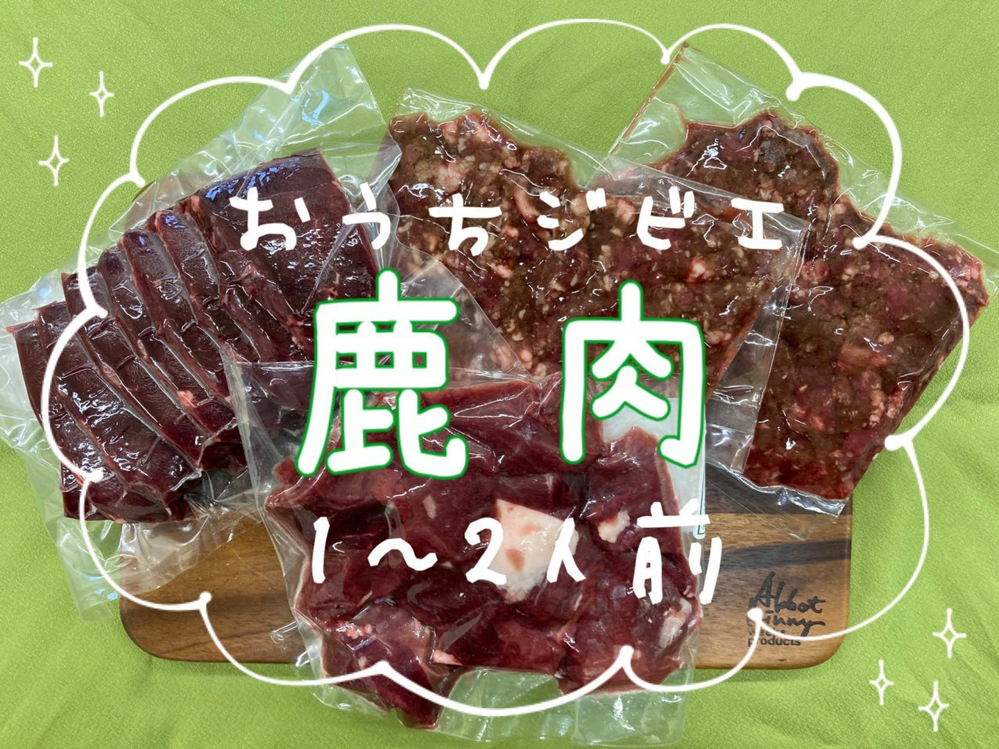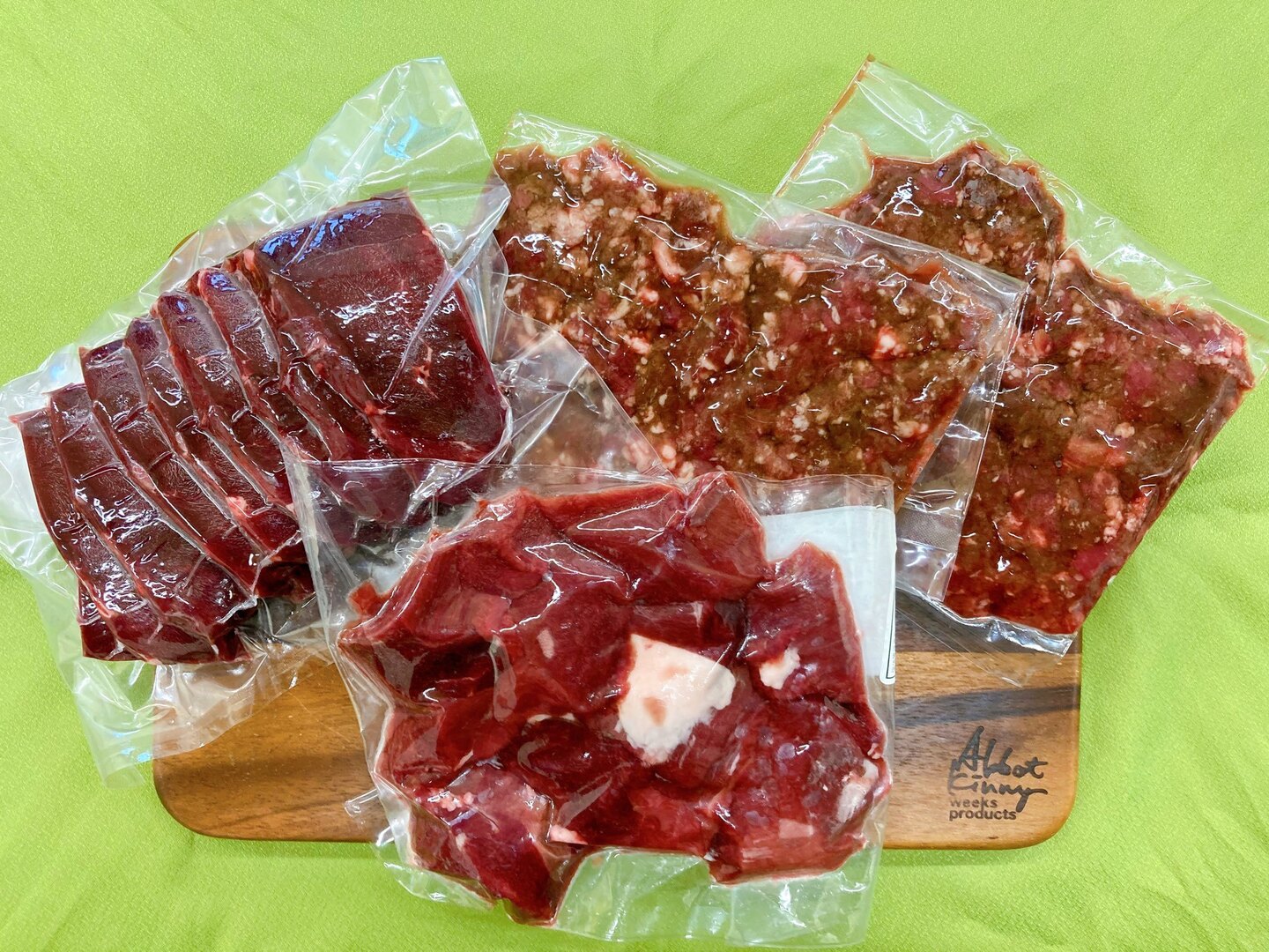 内容 鹿肉スライス200g・鹿肉粗挽ミンチ300g(150g×2パック)・鹿肉煮込み用カット200g