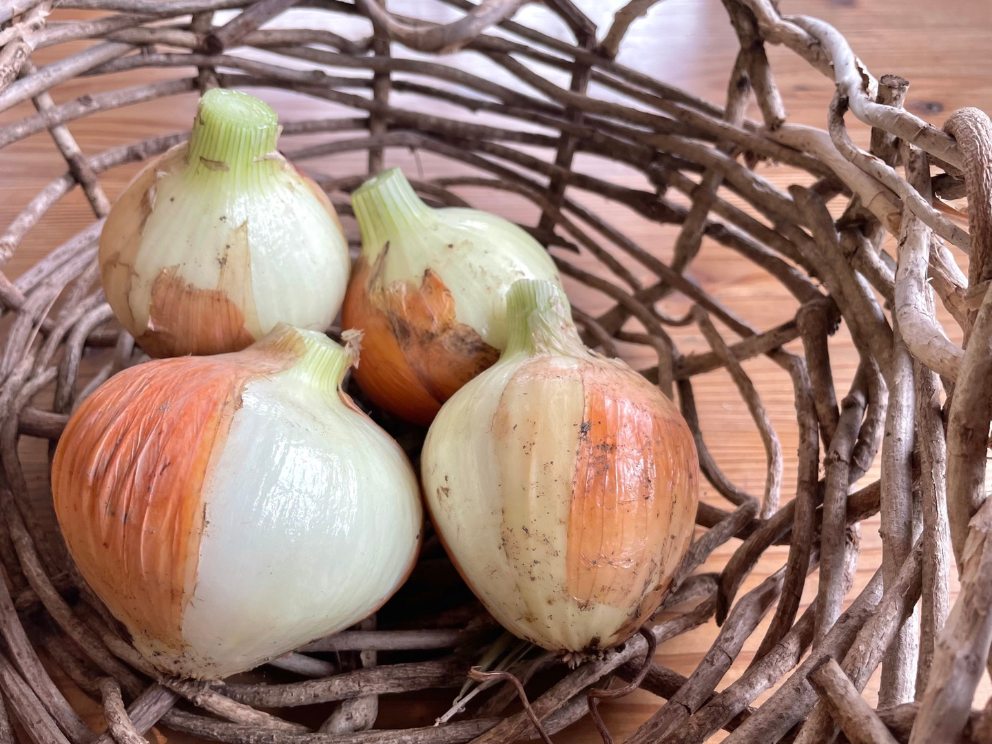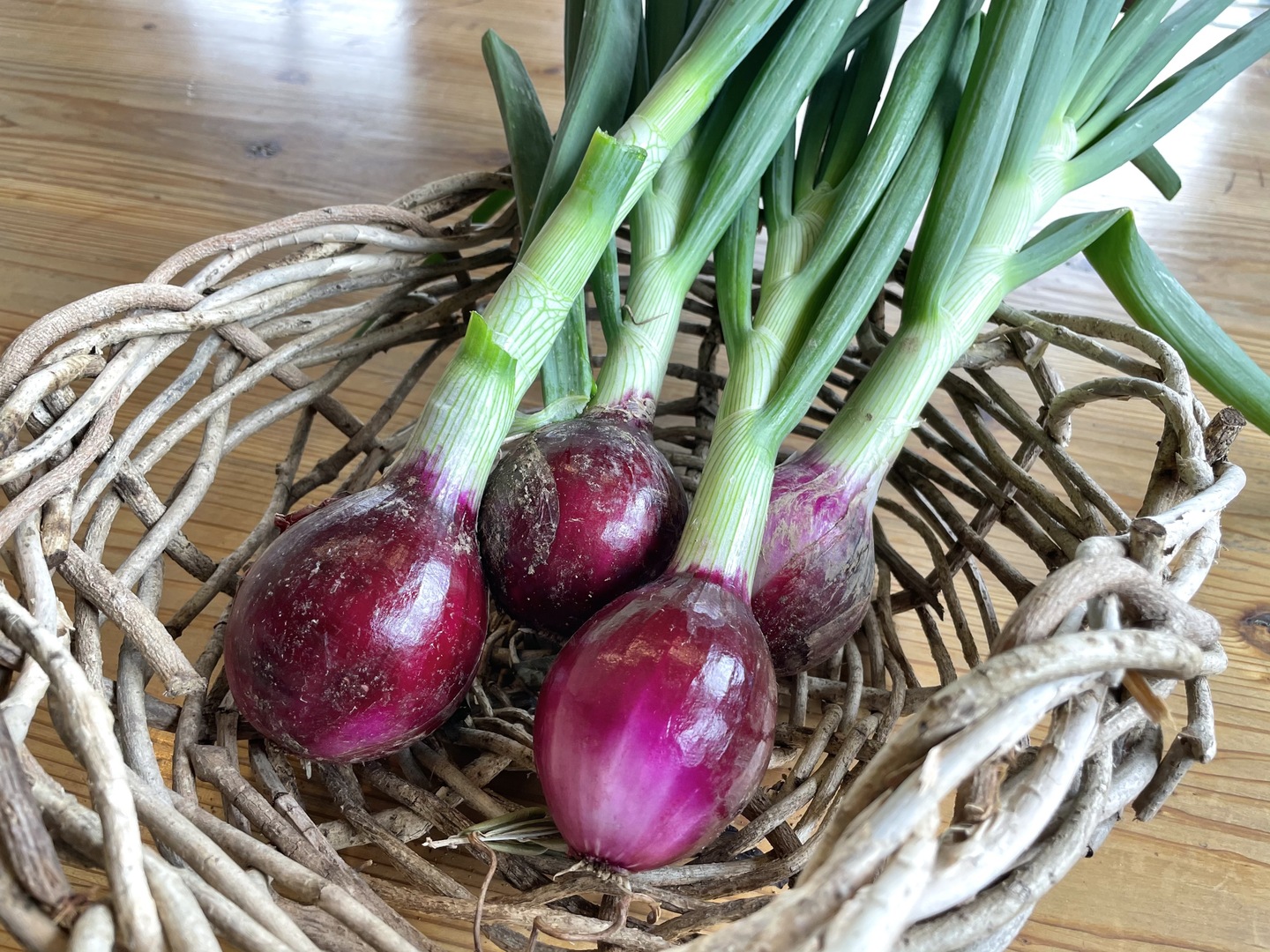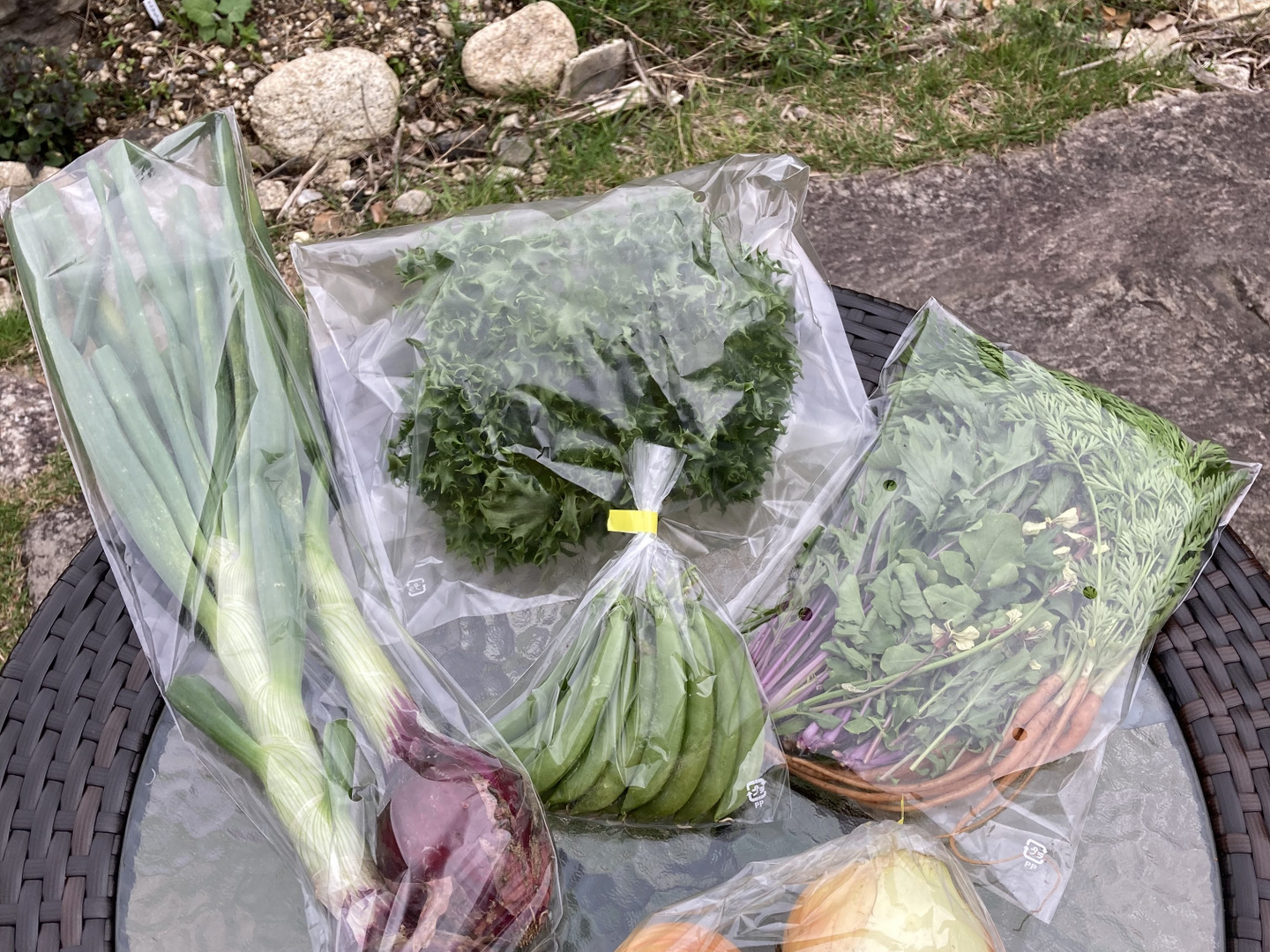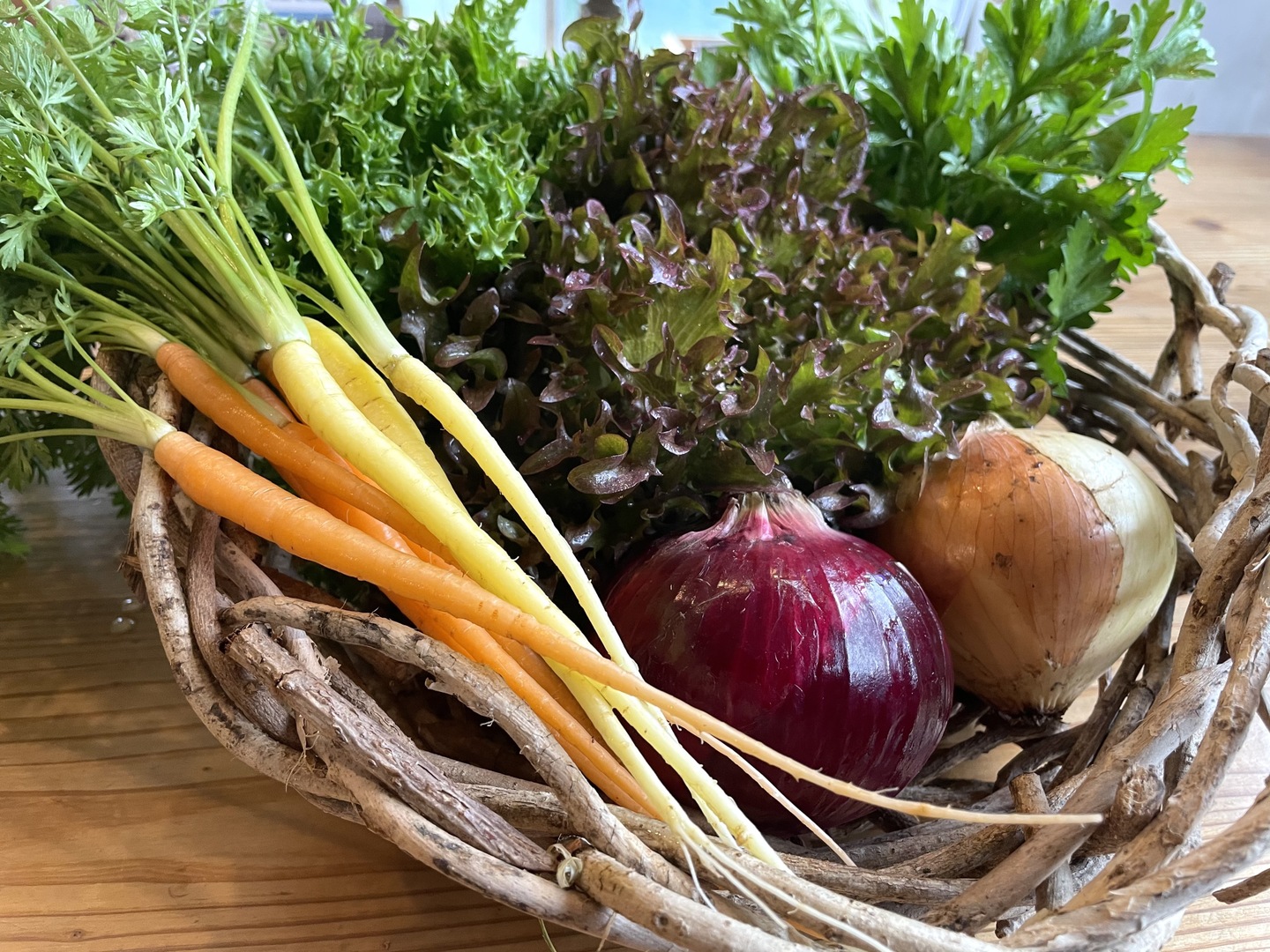 ミニトマト、那須、玉ねぎ、赤玉葱、万願寺、じゃがいも、バジル、人参葉、金時草等、旬のお野菜がメインです。