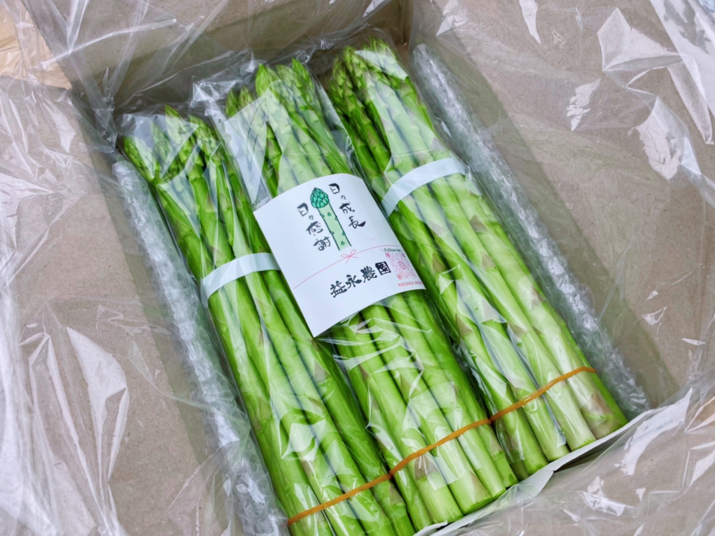 私たちがお届けするアスパラガスは、穂先から袋がけを行っており、繊細な穂先を保護するだけでなく、そのまま根本を水につけて保存できるようにしています。おすすめのレシピや、アスパラガスの保存方法をご紹介したものも同封しておりますので、ぜひご活用ください。