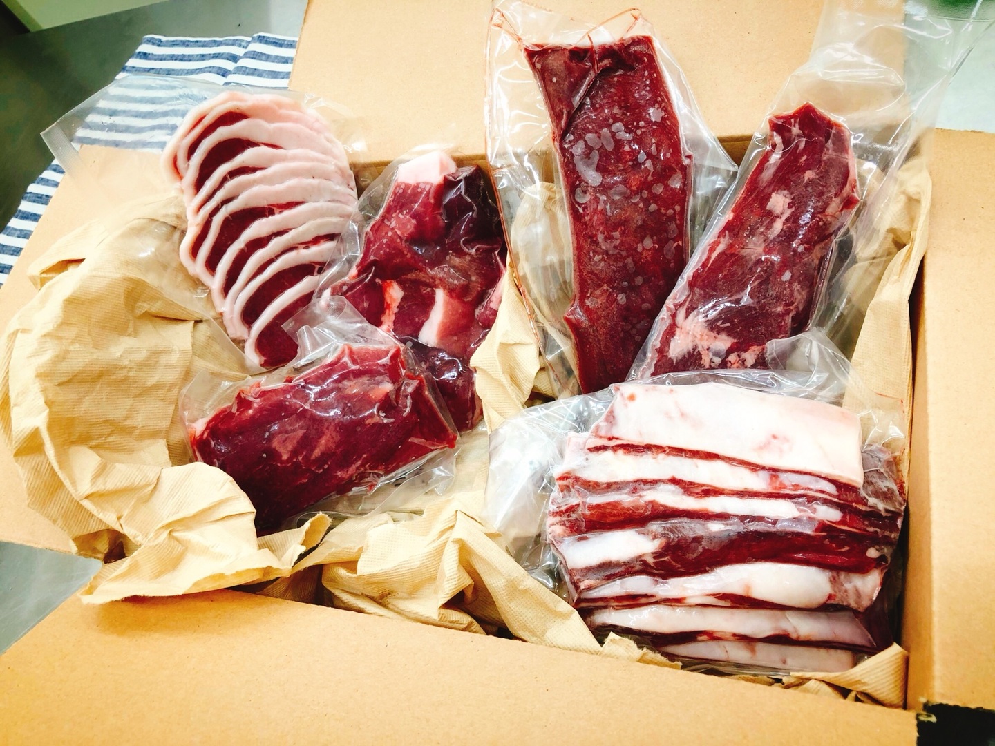 100g〜200gに小分けしたスライス、ブロック、カットのお肉をおまかせで詰め合わせたセットとなります。