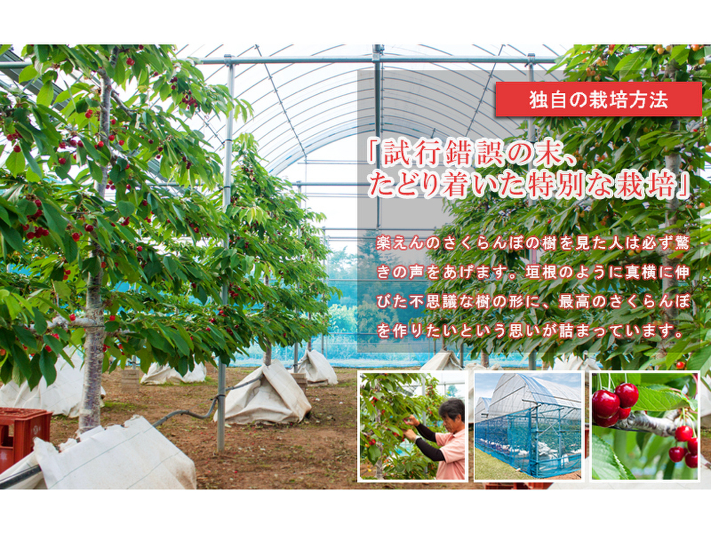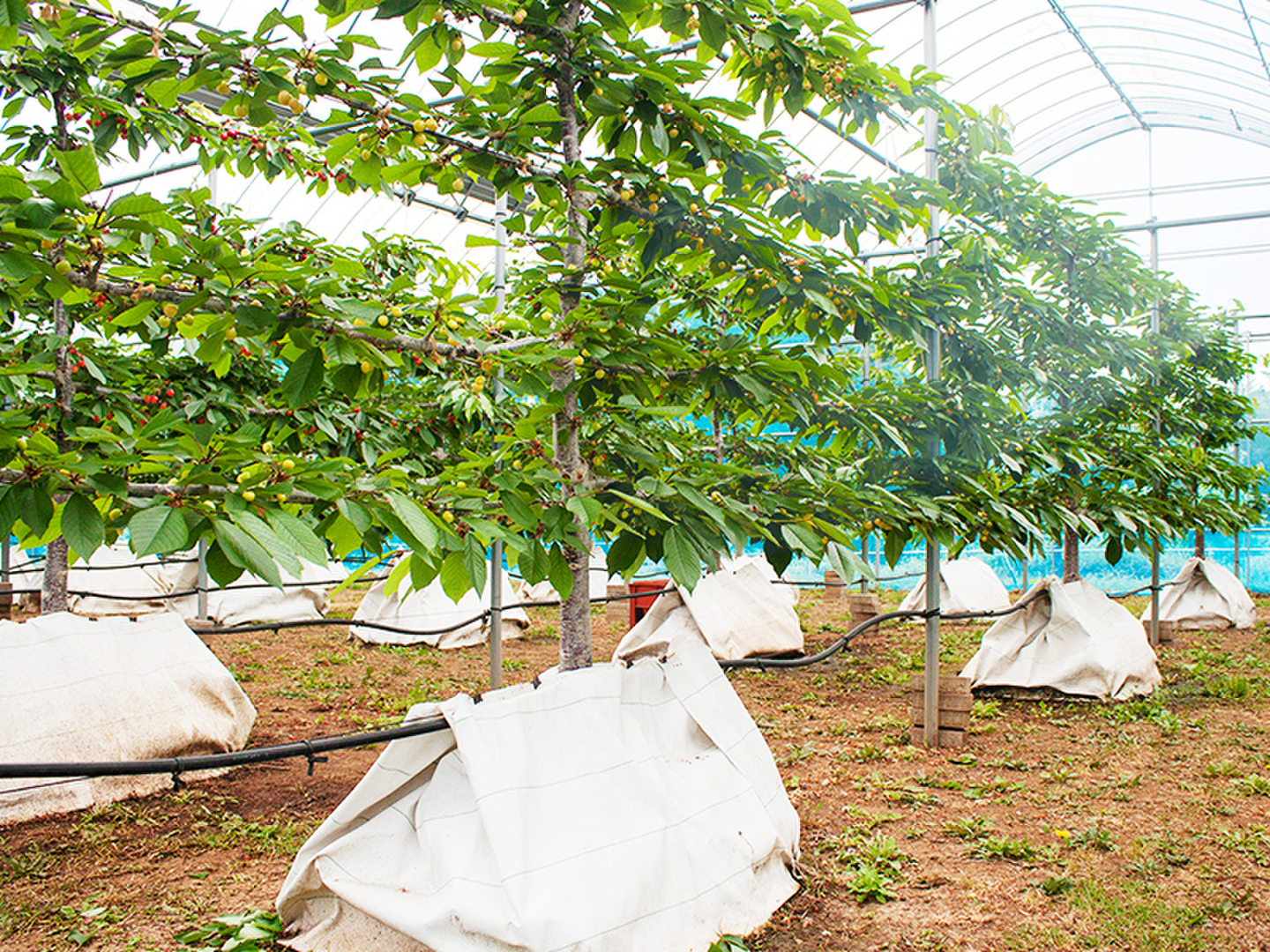 「根圏制御栽培」は、さくらんぼの根が求める水分や栄養分を細かく調整し、土壌を最適な状態に保つことで、さくらんぼが持つ能力を最大限に引き出す土壌管理方法です。