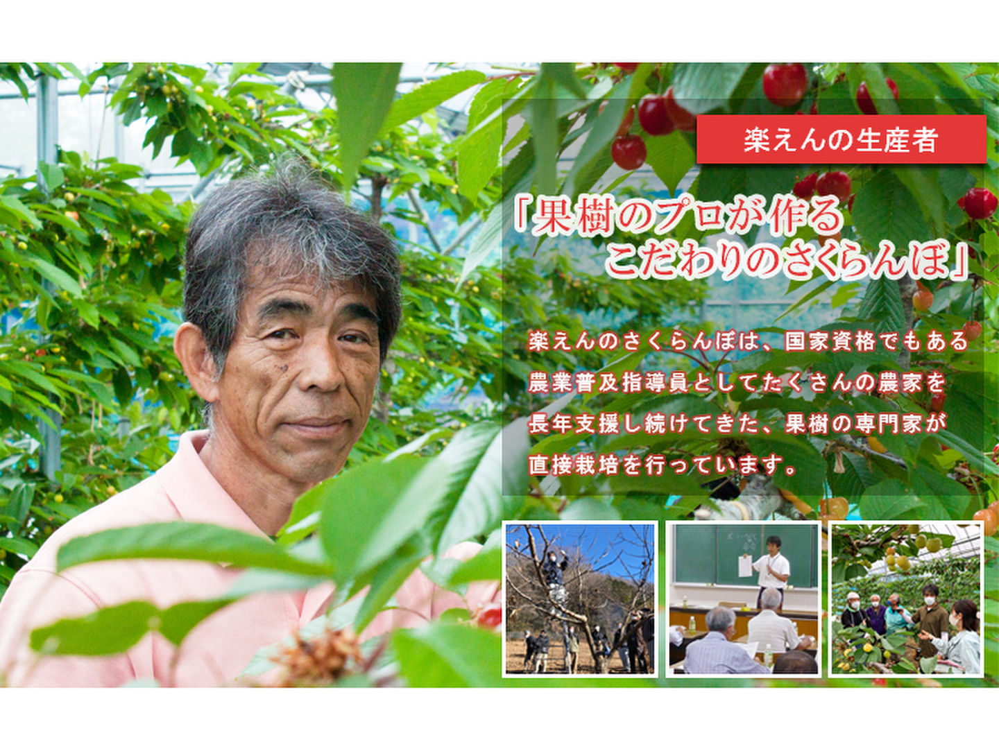 さくらんぼ栽培がまだ主流ではない埼玉県において、当園(楽えん)のさくらんぼは有名産地のブランド基準を上回るほどの味と品質が特徴です。