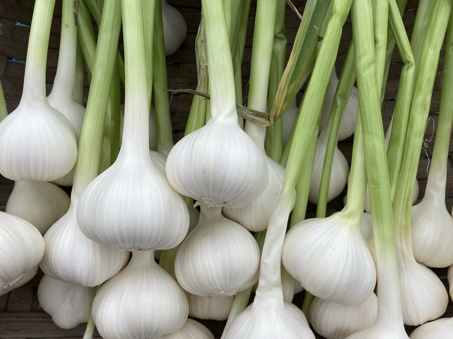 こちらのニンニクは収穫後根を切り落とし、湿気を取るため数枚皮をめくり、頭数センチ残して切ります。