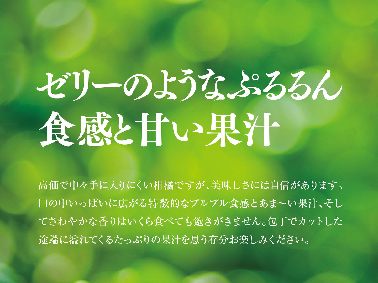 高価で中々手に入りにくい柑橘ですが、美味しさには自信があります。口の中いっぱいに広がる特徴的なプルプル食感とあま~い果汁、そしてさわやかな香りはいくら食べても飽きがきません。包丁でカットした途端に溢れてくるたっぷりの果汁を思う存分お楽しみください。