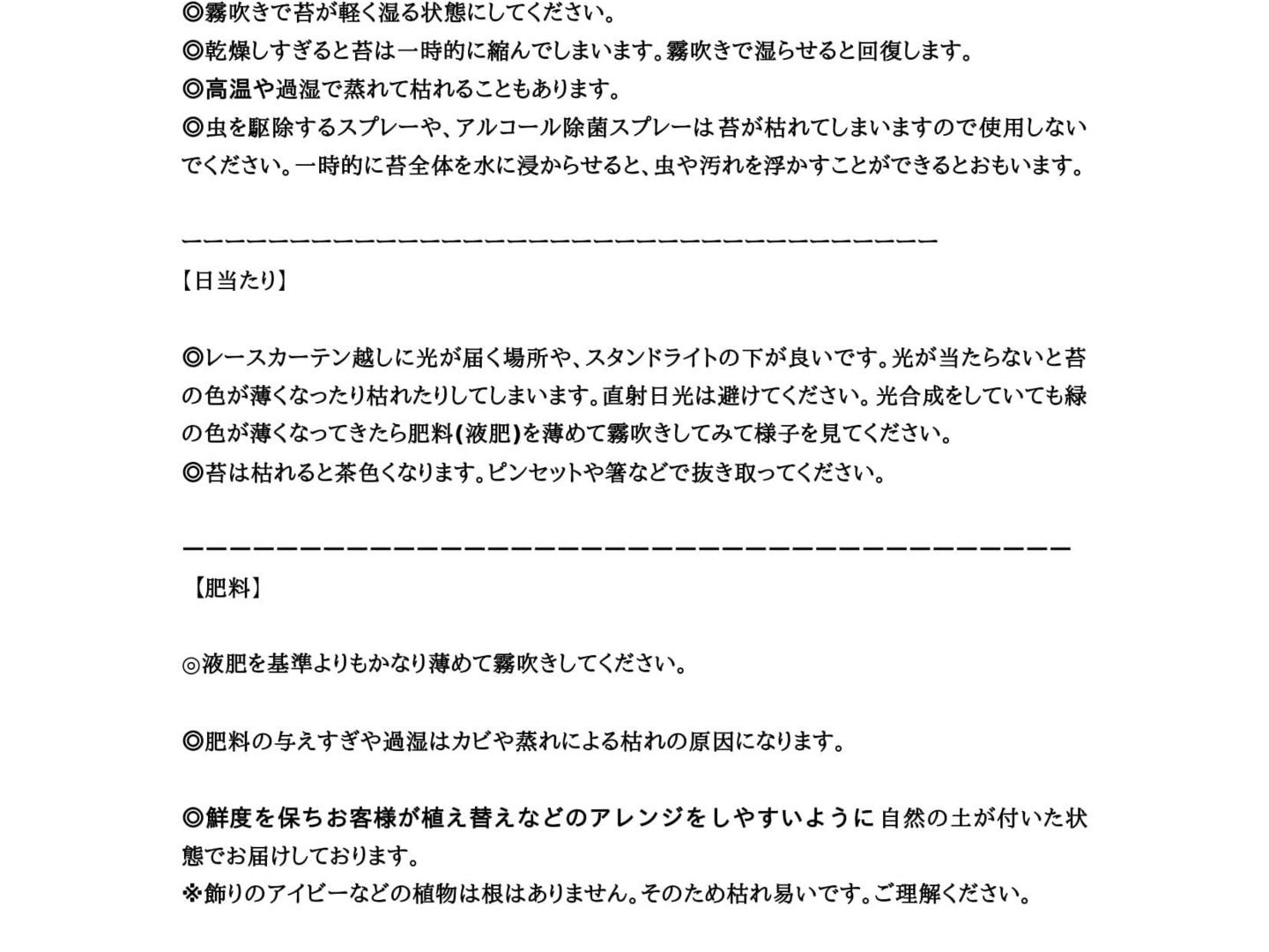 ーーーーーーーーーーーーーーーーーーーーーーーーーーーーーーーーーーー【日当たり】◎レースカーテン越しに光が届く場所や、スタンドライトの下が良いです。光が当たらないと苔の色が薄くなったり枯れたりしてしまいます。直射日光は避けてください。光合成をしていても緑の色が薄くなってきたら肥料(液肥)を薄めて霧吹きしてみて様子を見てください。◎苔は枯れると茶色くなります。ピンセットや箸などで抜き取ってください。