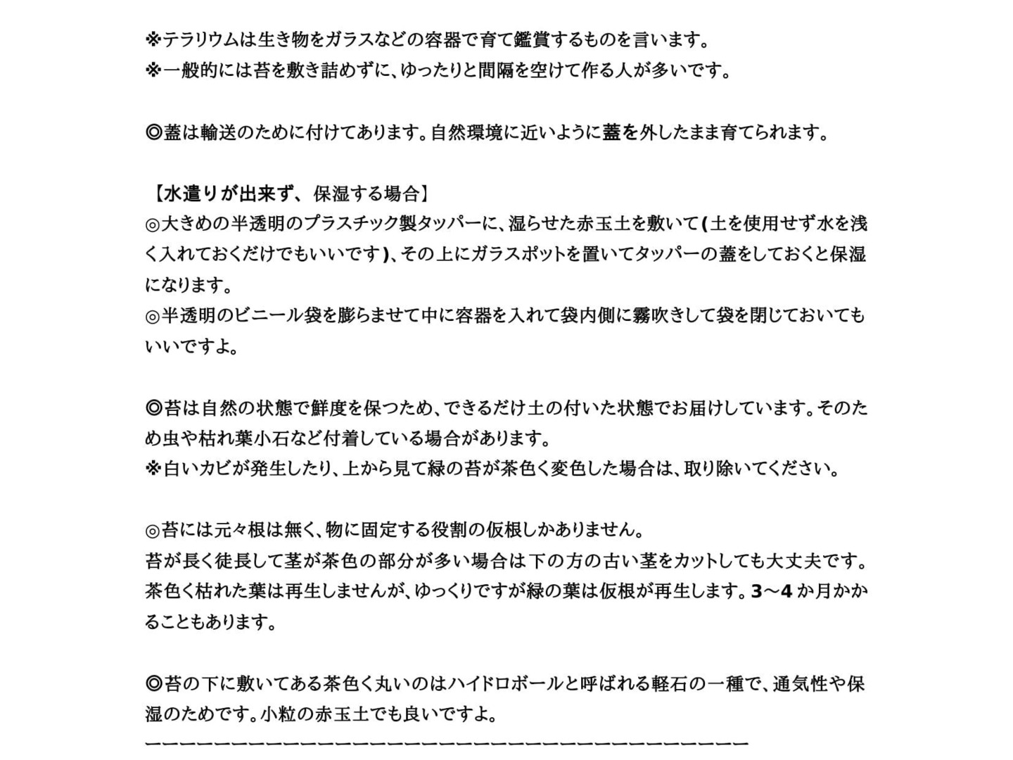 苔が長く徒長して茎が茶色の部分が多い場合は下の方の古い茎をカットしても大丈夫です。茶色く枯れた葉は再生しませんが、ゆっくりですが緑の葉は仮根が再生します。3~4か月かかることもあります。◎苔の下に敷いてある茶色く丸いのはハイドロボールと呼ばれる軽石の一種で、通気性や保湿のためです。小粒の赤玉土でも良いですよ。ーーーーーーーーーーーーーーーーーーーーーーーーーーーーーーーーーーー【開封後】◎ピンセットや箸で苔の向きや配置を整えたり、指先で軽く苔をなでてあげて見た目を整えます。輸送中にばらけて見映えが良くないときはガッカリさせてしまいごめんなさいね。気持ちを改めて、植え直すときは※人差し指・中指・親指で仮根を摘み束ねるようにして、仮根部分をピンセットや箸で摘まんでで用土に軽く挿します。ーーーーーーーーーーーーーーーーーーーーーーーーーーーーーーーーーーーーーー