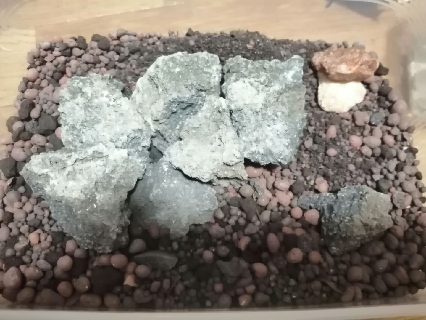 ◎大きめの半透明のプラスチック製タッパーに、湿らせた赤玉土を敷いて(土を使用せず水を浅く入れておくだけでもいいです)、その上にガラスポットを置いてタッパーの蓋をしておくと保湿になります。