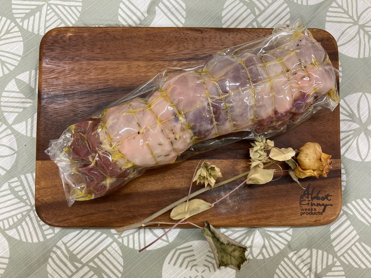 こちらの商品はハーブや塩コショウをすり込んで巻き、紐で縛って成形した状態でのお届けとなります。