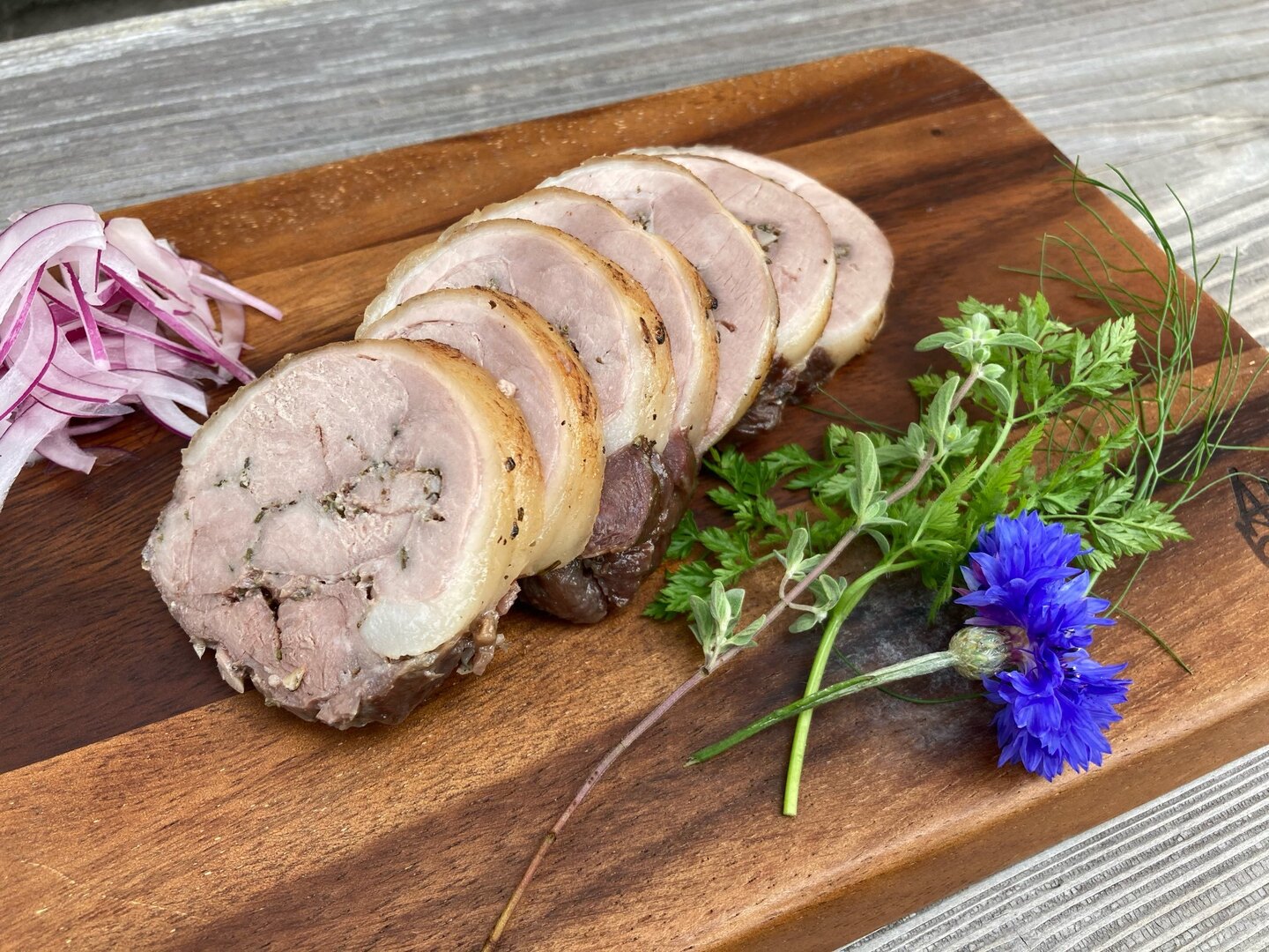 あっさりと優しい味わいの仔猪肉を、イタリア料理のポルケッタ仕込みにしてみました!
