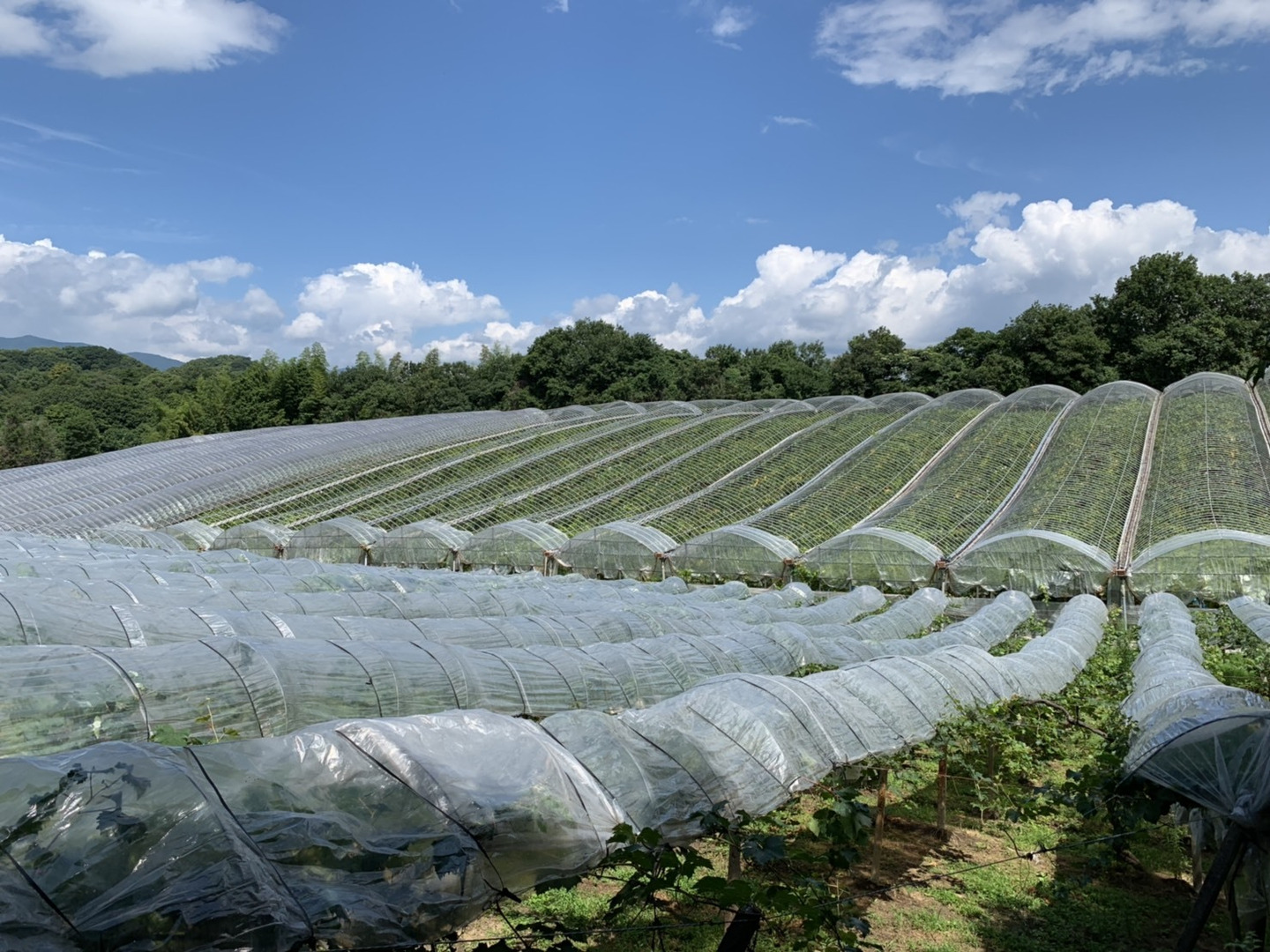 福岡県嘉麻市は周りを山々に囲まれた自然豊かな所です。ミネラル豊富な地水で育ったぶどうを是非お召し上りください。