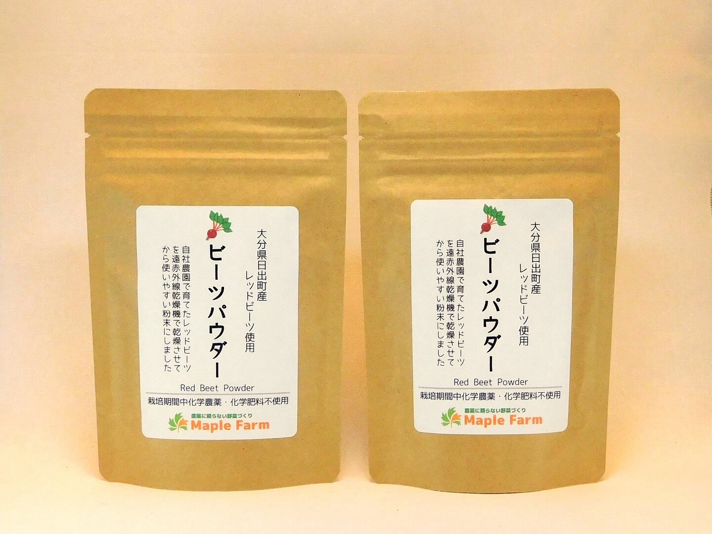 商品について あわせ買い対象 同生産者の別の「あわせ買い対象」商品と一緒にご注文いただくと、送料をまとめてお届けできる場合があります。 生産者からのお知らせ メール便発送商品を複数ご購入希望のお客様へメール便(クリックポスト)発送商品は、同じ商品であってもシステム上【1点ごと】に送料が360円かかります。注文画面にて送料を必ずご確認ください。また、複数のご注文や、他の商品と同梱をご希望の場合は専用の注文ページを作成致しますので、遠慮なくお問い合わせ下さい。なお、複数ご注文頂きました場合でも、1点ごとに送料がかかる旨の確認連絡はしておりませんので、予めご了承くださいませ。 もっと見る 内容 ビーツ粉末50g×2袋 重量・容量 約100g 発送 クリックポスト 送料 ¥ 常温便 + ¥ 0 数量1点ごとに送料が発生します。 種別 加工品 ドライフード 野菜 ビーツ デトロイト・ダークレッド 産地 大分県 特定原材料 なし 農薬化学肥料不使用 野菜 加工品 ドライフード デトロイト・ダークレッド 大分県x野菜 大分県x加工品 大分県xビーツ 大分県xドライフード 大分県xデトロイト・ダークレッド 商品説明 SDGsについて事務局よりお知らせ肥料は、地元産の抗生物質などの薬品を一切使用していないニワトリの鶏糞を使用し、不要なビーツの葉は畑に戻すなど、循環型農業を実践されています。パッケージ袋には植物由来の原材料が約20%含まれている、バイオマスフィルムを使用されています。バイオマスフィルムは石油由来のフィルムに比べCO2排出量を約10%削減することが出来、環境への配慮も心がけられています。----------------------------海と山に囲まれた自然豊かな大分県日出町(ひじまち)で栽培期間中農薬・化学肥料不使用で栽培されたレッドビーツ<和名:火焔菜(かえんさい)>の粉末です。ビーツはアメリカやヨーロッパで日常的に食べられている野菜です。大根やかぶの仲間と思われがちですが、ほうれん草と同じ仲間であるヒユ科(旧アカザ科)の野菜です。煮込み料理の「ボルシチ」が有名ですね。ビーツは【食べる輸血】と言われるほど栄養素が豊富な【スーパーフード!】鮮やかな赤色の正体は「ベタシアニン」というポリフェノールの一種で、ごく一部の野菜や果物にしか含まれていません。この「ベタシアニン」は抗酸化作用が高い健康成分として注目されています。そんな毎日摂りたいスーパーフードのビーツですが、生が出回る時期は限られていて、手に入ったとしても下処理がちょっと面倒だったりします・・・。そこでオススメしたいのがビーツパウダー♪当園のビーツパウダーは、収獲したての新鮮なビーツをきれいに洗浄した後、皮表面を熱湯消毒してから皮ごとカット・乾燥・粉砕していますので、ビーツの栄養素を丸ごと摂ることができます!加熱不要で、そのままお使い頂けますよ。色鮮やかに食卓を彩る【ビーツパウダー】を是非お試し下さい。50g×2袋(チャック付き)をメール便でご自宅のポストへお届けします。【パウダーの細かさについて】原料ビーツの糖度の違いで、お届けする時期によりパウダーの細かさに違いがございます。予めご了承ください。(市販品に使用されるサラサラ状態を保つ食品添加物「デキストリン」は使用していません。)当園のビーツパウダーは70メッシュのふるいにかけています。メッシュ数は大きくなるほど細かくなり、上白糖:30メッシュ、上新粉:100メッシュ、小麦粉:150~200メッシュです。【ご確認ください】※こちらの商品ページから2セット以上ご注文頂きますと、1セットごとに送料360円がかかってしまいます。複数セットや、他の商品と同梱をご希望の場合はご注文前にお問い合わせ下さい。※ビーツはシュウ酸を含む野菜ですので、腎臓疾患や尿路結石の有る方は、お召し上がり前に医師とご相談下さい。※高温調理・長時間調理や、アルカリ性の食品(重曹など)と一緒に調理した場合、変色や色が薄くなる場合がございます。(パンやパンケーキ、クッキーなどは中まで赤くなりません。)※ビーツは特有の土臭さがある野菜です。乾燥・粉末にすることにより、飲み物に入れてもほぼ分からないくらいに低減していますが、気になる方は加熱調理やお酢(ドレッシングやピクルス液など)と合わせた調理法をおすすめしています。名称:ビーツ粉末原材料名:ビーツ(大分県産)賞味期限:期限まで3か月以上の物をお届けします。食品添加物:無し(デキストリン不使用)内容量:50g×2袋粒子の細かさ:70メッシュのふるいにかけています。お召し上がり目安量:1日2g~5g重さの目安:小さじ1で3g保存方法:高温多湿を避け冷暗所で保管製造者名称:メープルファーム※特定原材料8品目の内、小麦・落花生・クルミを使用した設備で製造しています。<おすすめの召し上がり方>そのまますぐお使い頂けます!・スムージーなどのお飲み物やヨーグルトに。・クッキーやパンケーキなどの色付けに。・ポタージュスープやシチューに。・ポテトサラダやドレッシング・マ