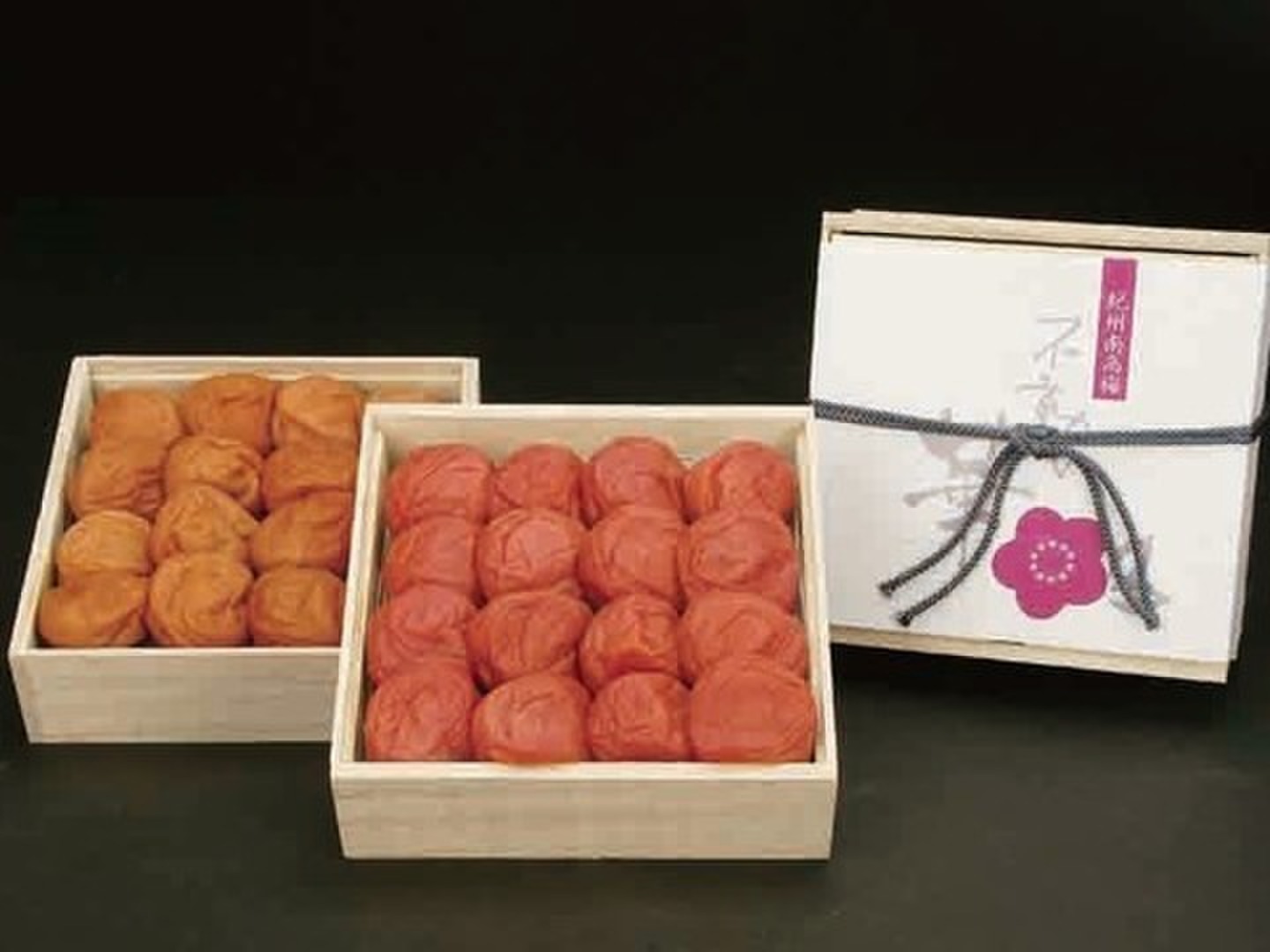 【夏ギフト】不動の華白木(2段)900g、紀州南高つぶれ梅1パック、種ぬき干し梅 1袋 合計3アイテムセット