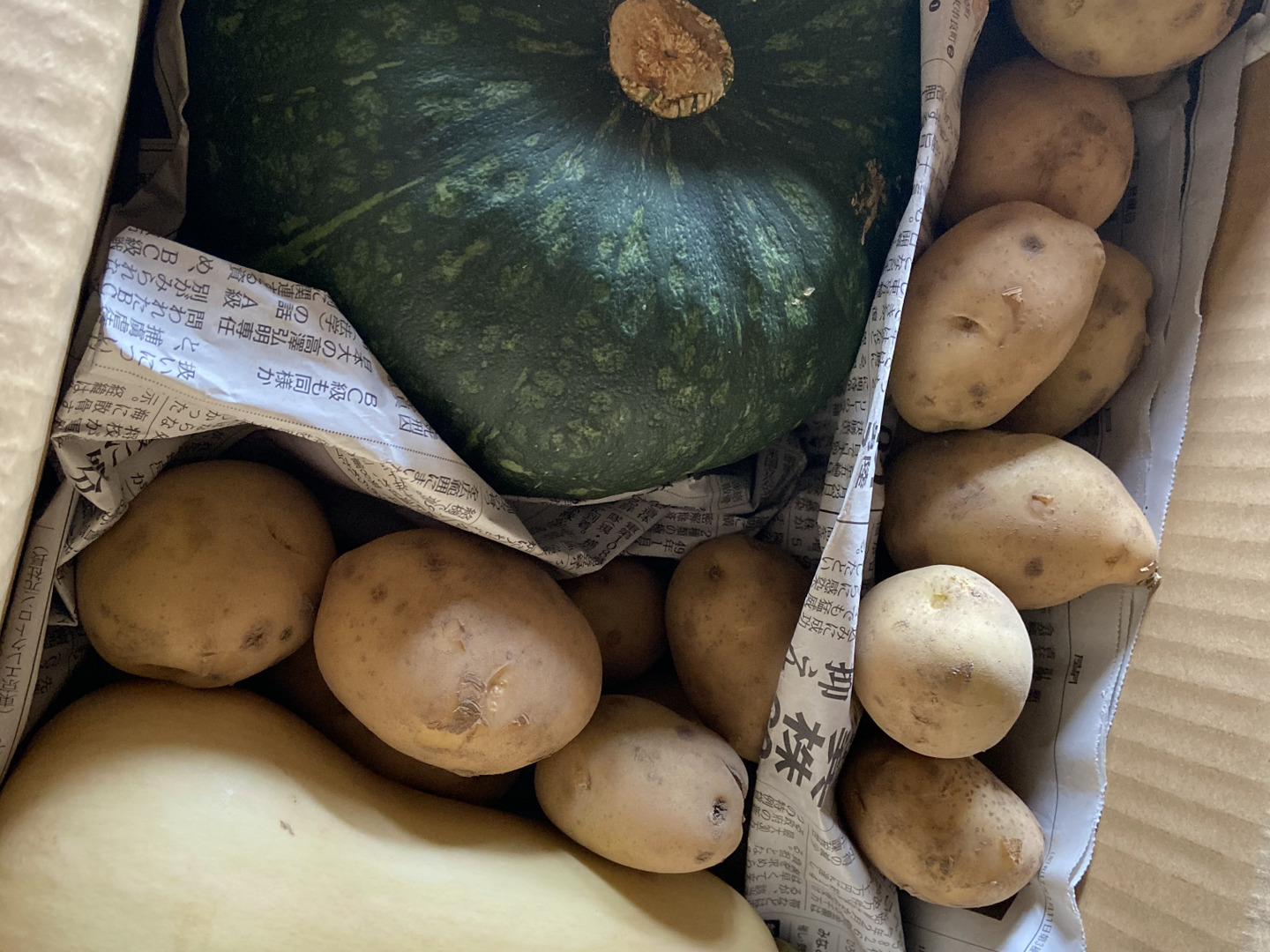 旬のえびすかぼちゃ(2kg)1個とバターナッツ1個、じゃがいも(デジマ)の詰め合わせです。