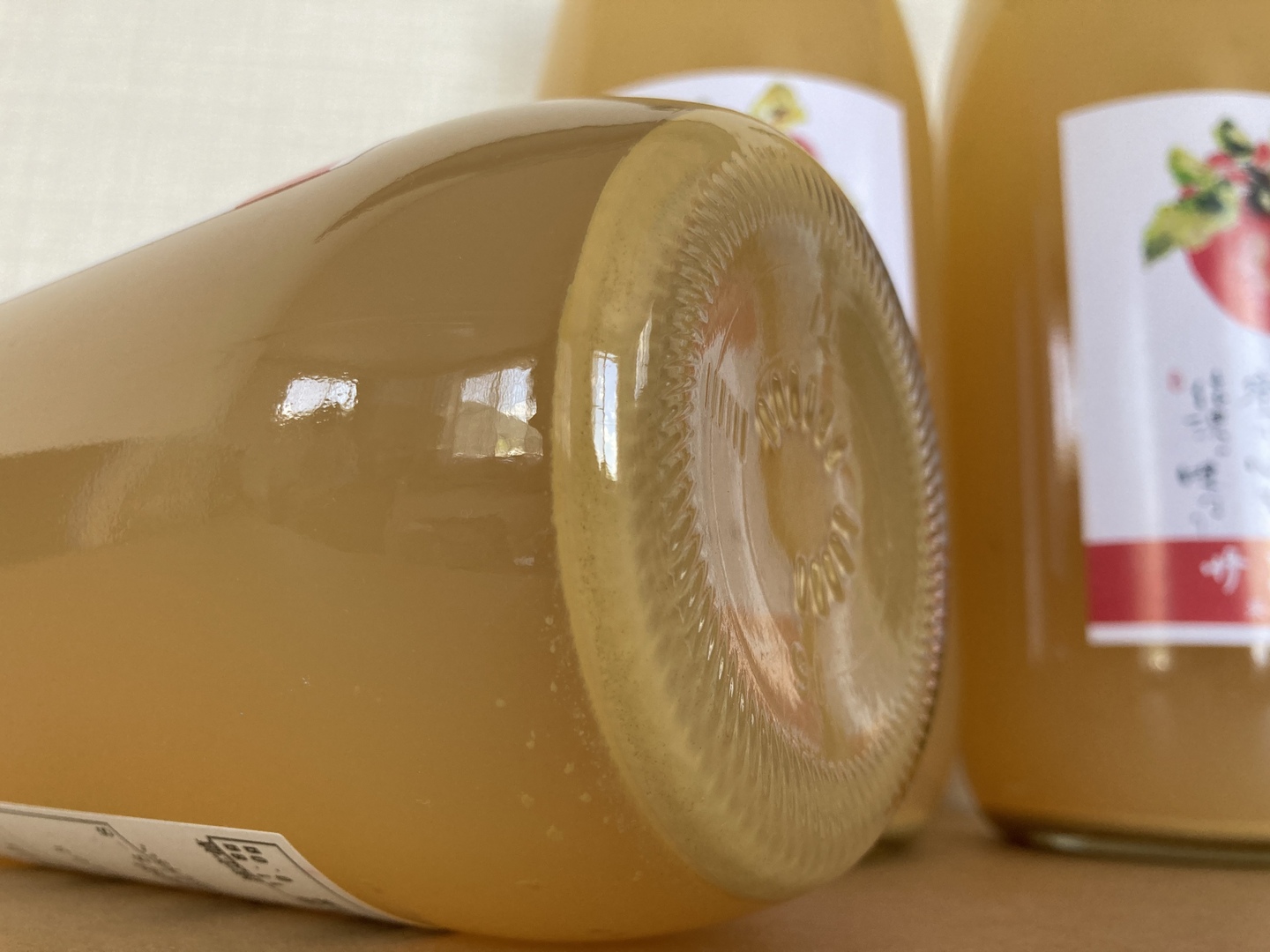〇ストレートジュースの特徴である「沈殿」がビンの底にあります。