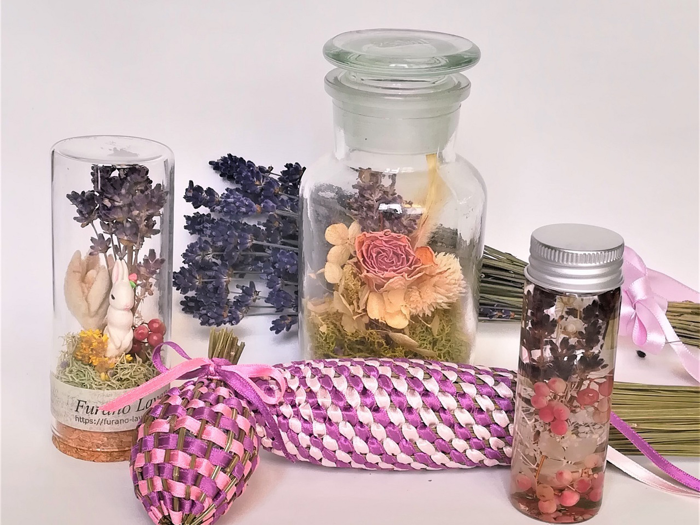 リース作り、フラワーアレンジメント、サシェ、ラベンダースティックなど。