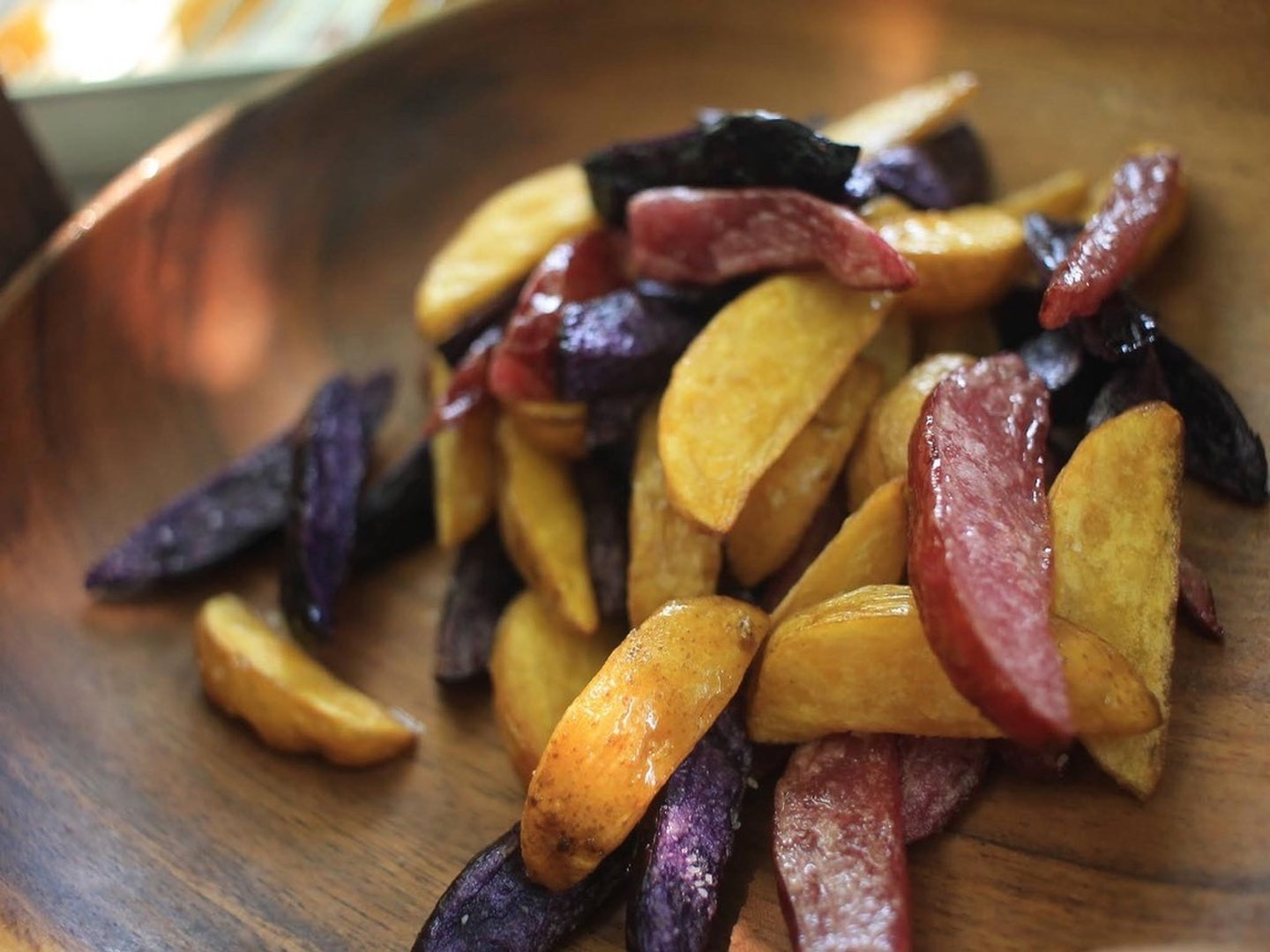 中がかわいいピンク色になっているノーザンルビー。3色で食べ比べるととても映えます。味としてはメークイン系。でんぷん質が多く、ややねっとりしており、型崩れしにくく、揚げ物、煮物、炒めものなど、あらゆる料理に使いやすくなっています。