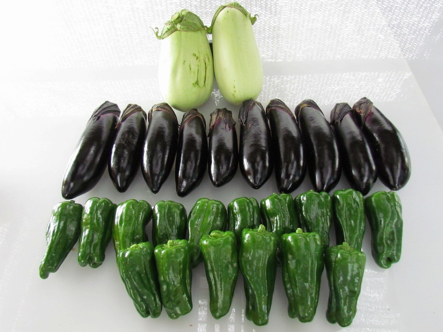 オクラ(ダビデの星)15-20本、緑ナス2-3本、筑陽なす3-6本、京波ピーマン15-20個