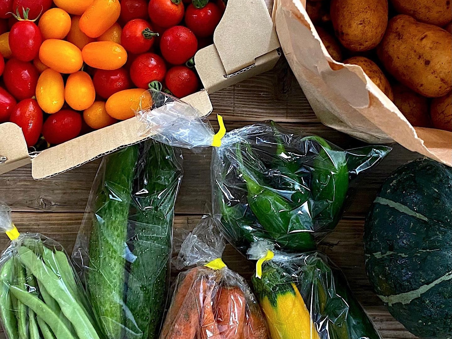 ミニトマトたっぷり かぼちゃ じゃがいも を中心に色々な野菜が入っています。