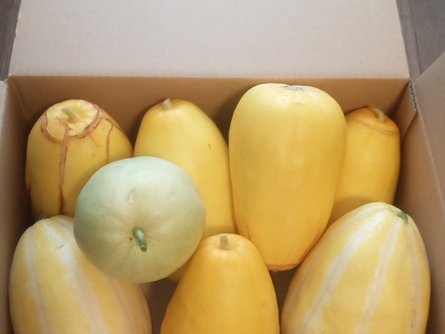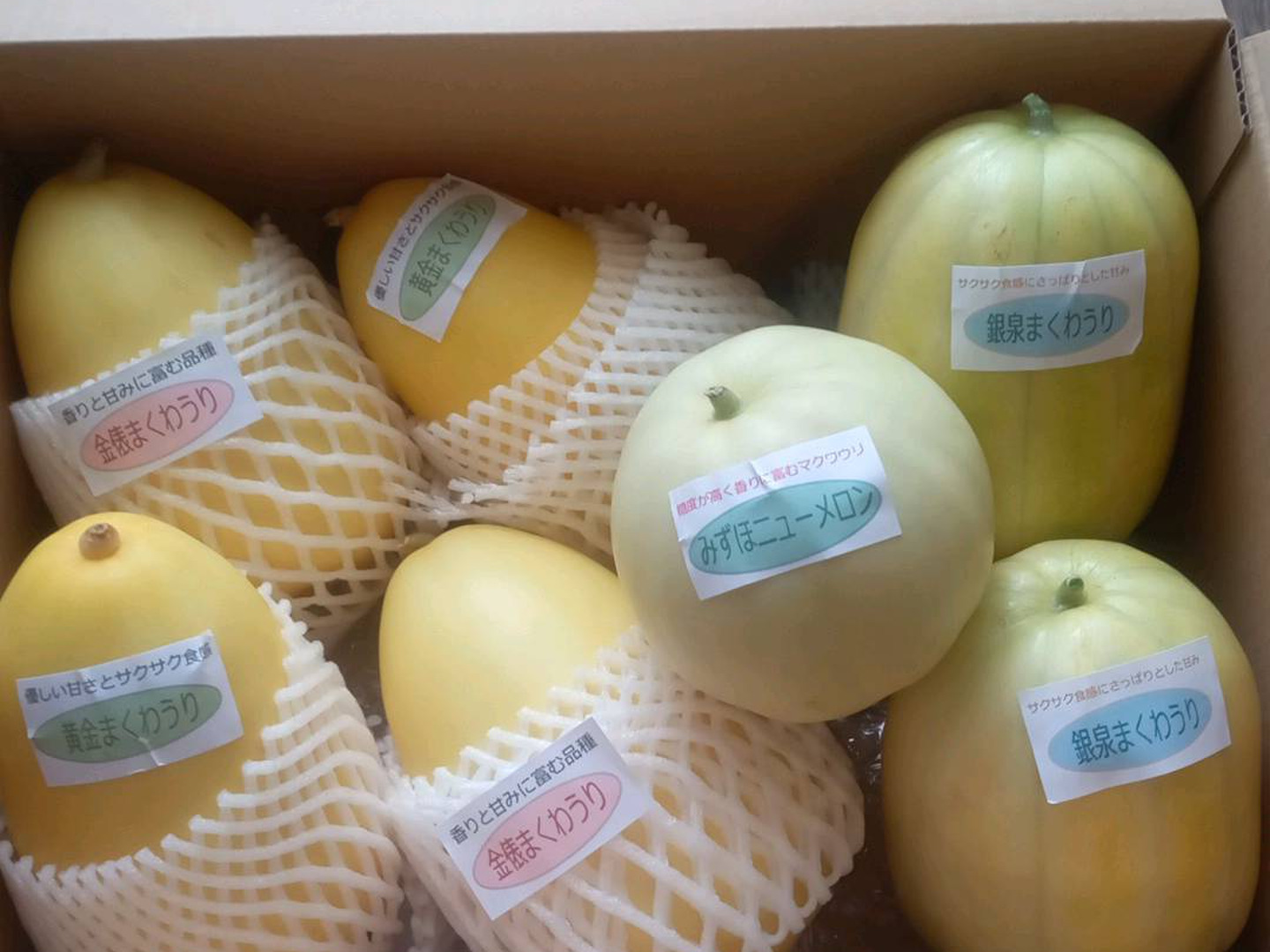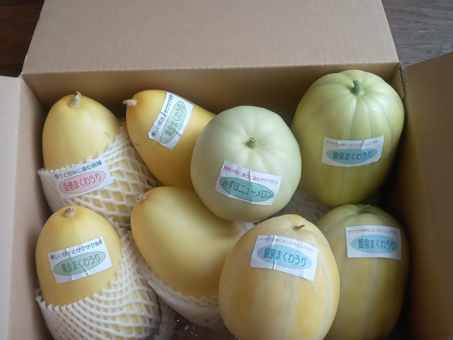 店頭ではあまりお目にかかることがない自然の甘さとサクサク食感が特徴のマクワウリセットです。品種は「黄金マクワウリ」「金俵マクワウリ」で、サイズにもよりますが6〜9個に季節の野菜を複数種類プラスしたセットです。